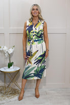 K.Design Cream, Green & Navy Leaf Print Midi Dress Description