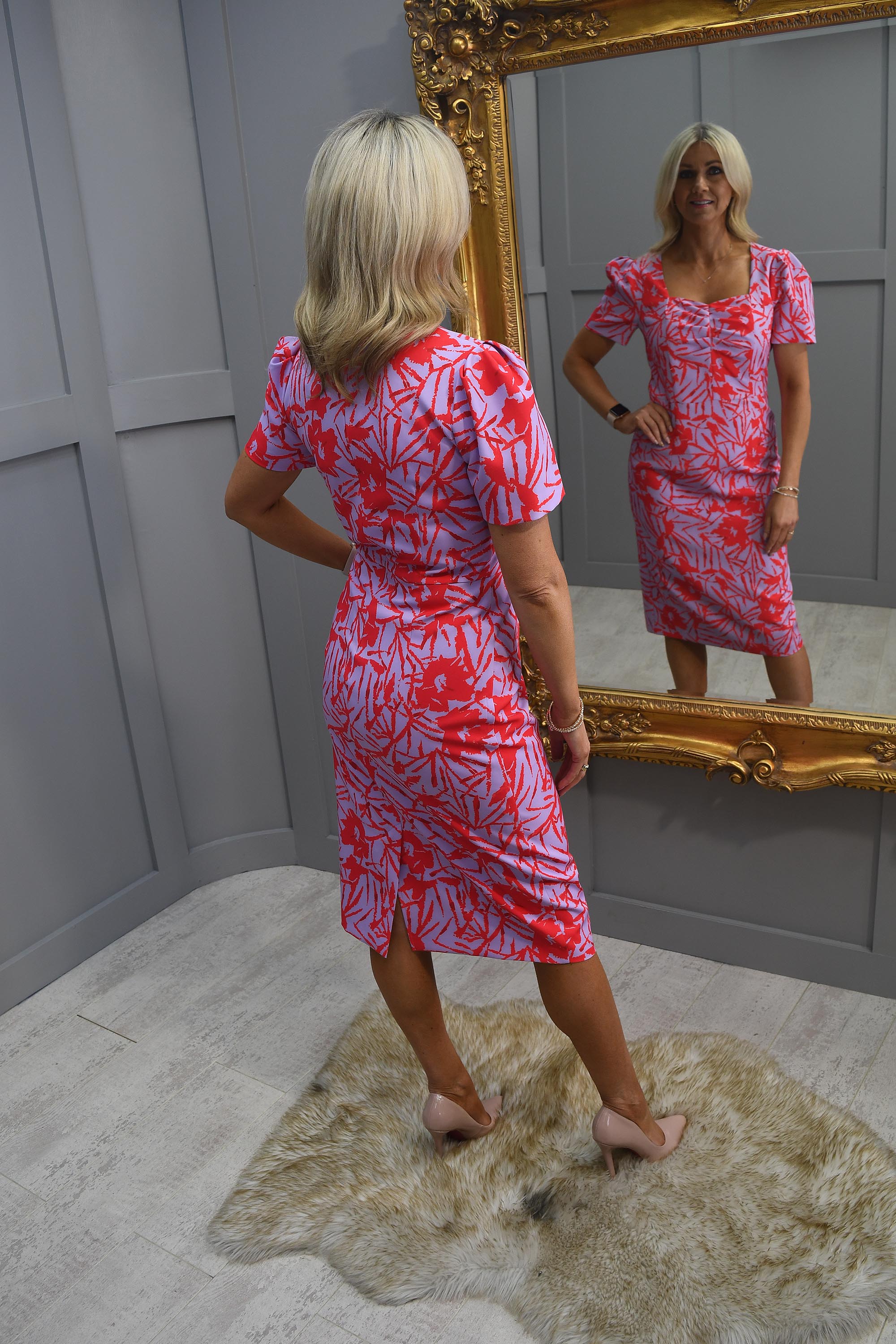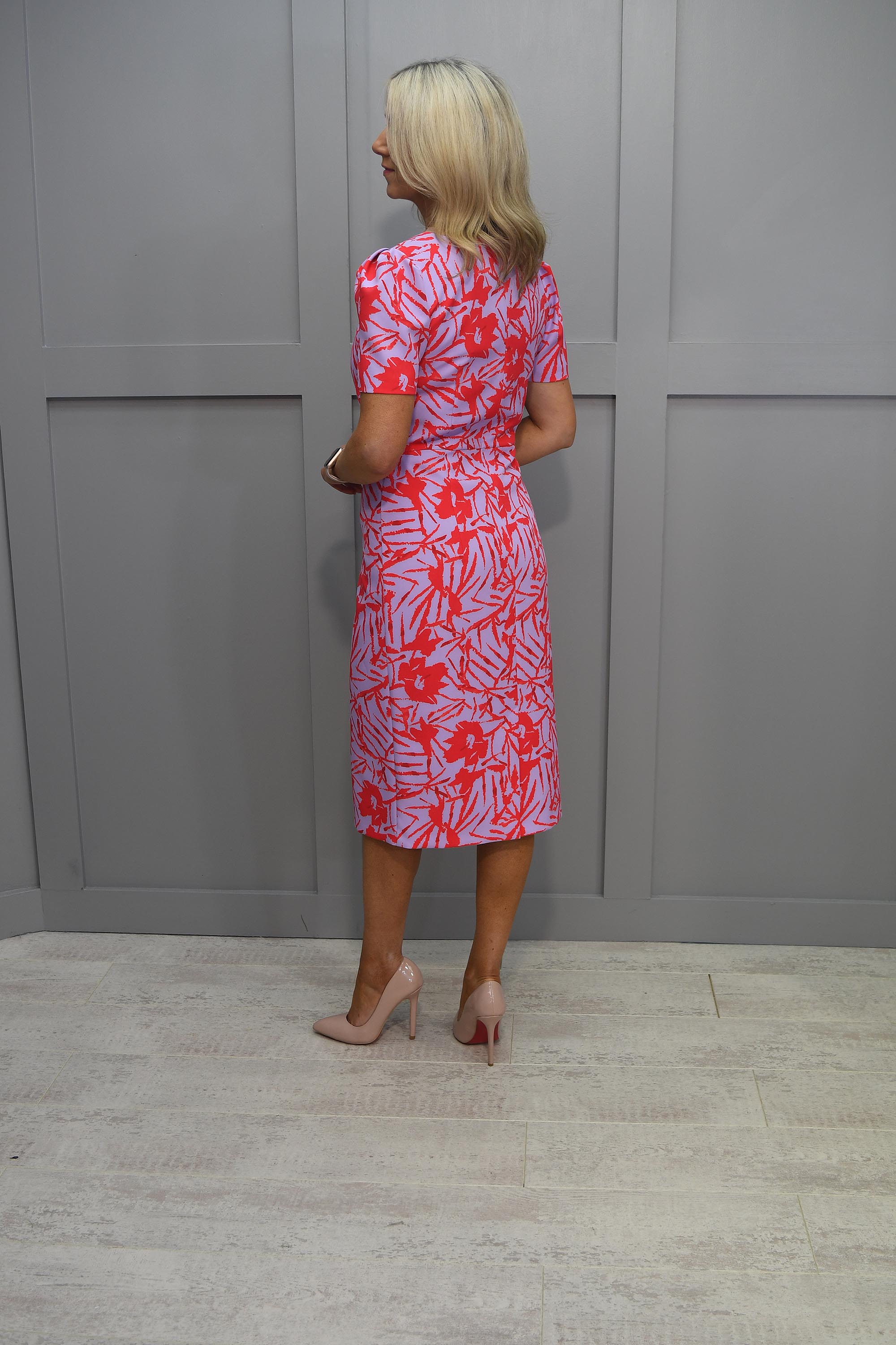 Kate Cooper Lilac & Red Straight Dress With Sweetheart Neckline Description