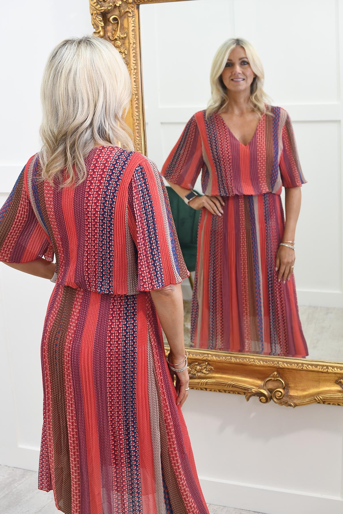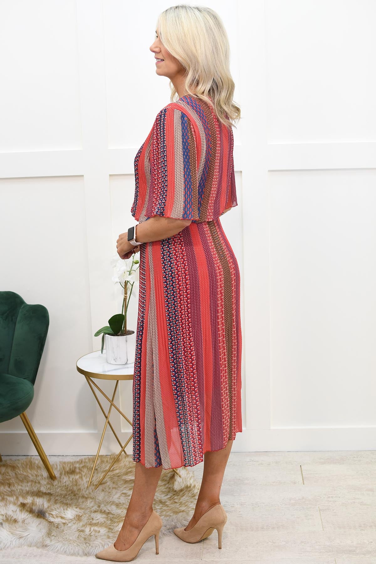 Kyla Burnt Orange, Plum & Blue Mixed Print Plisse Dress Description