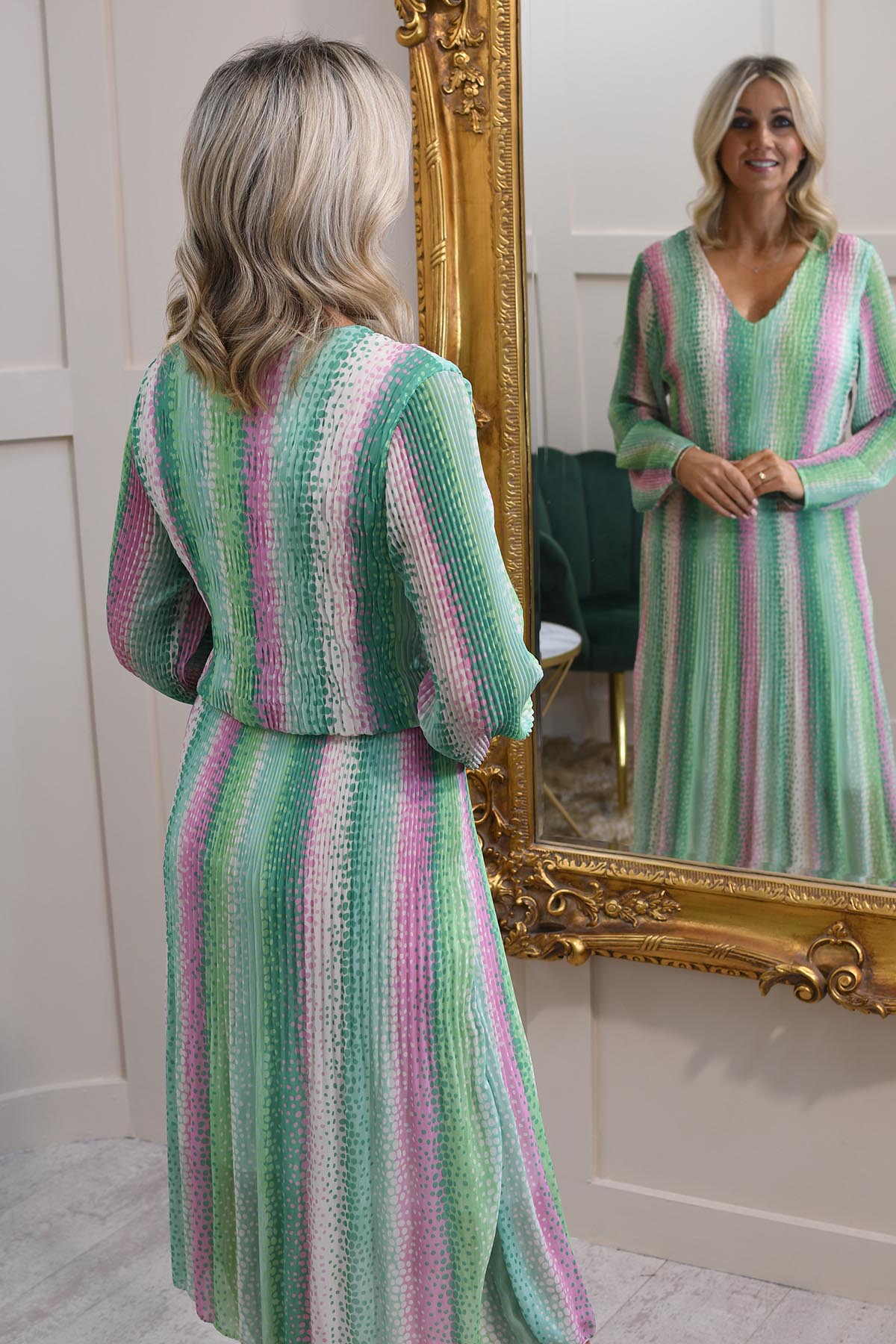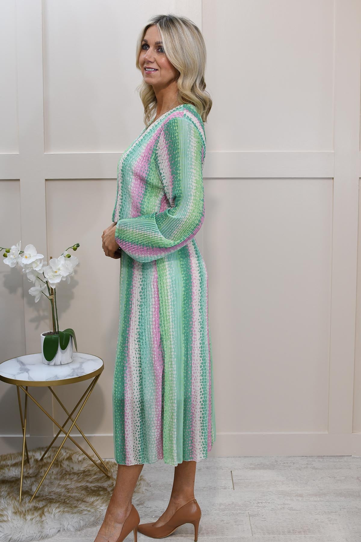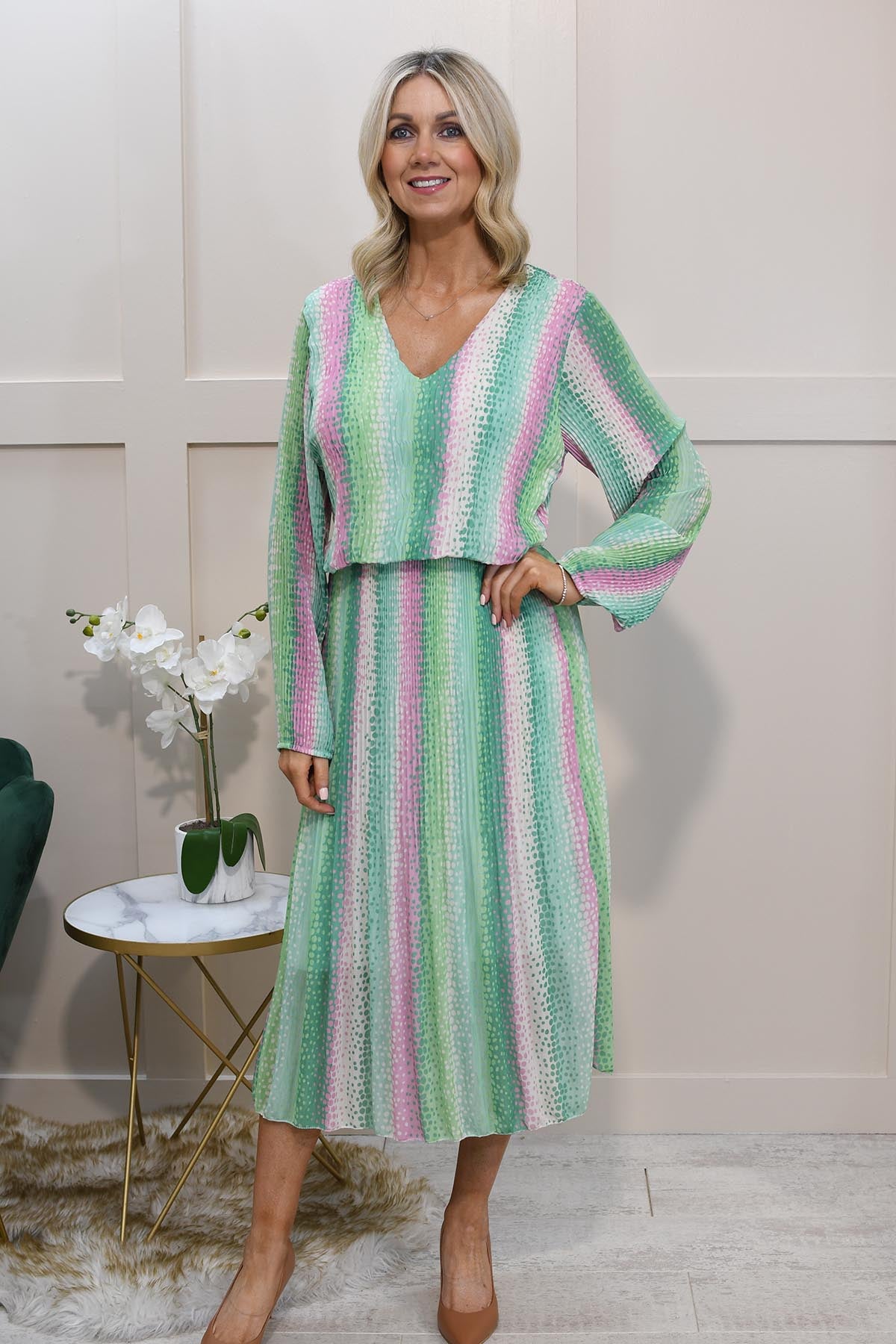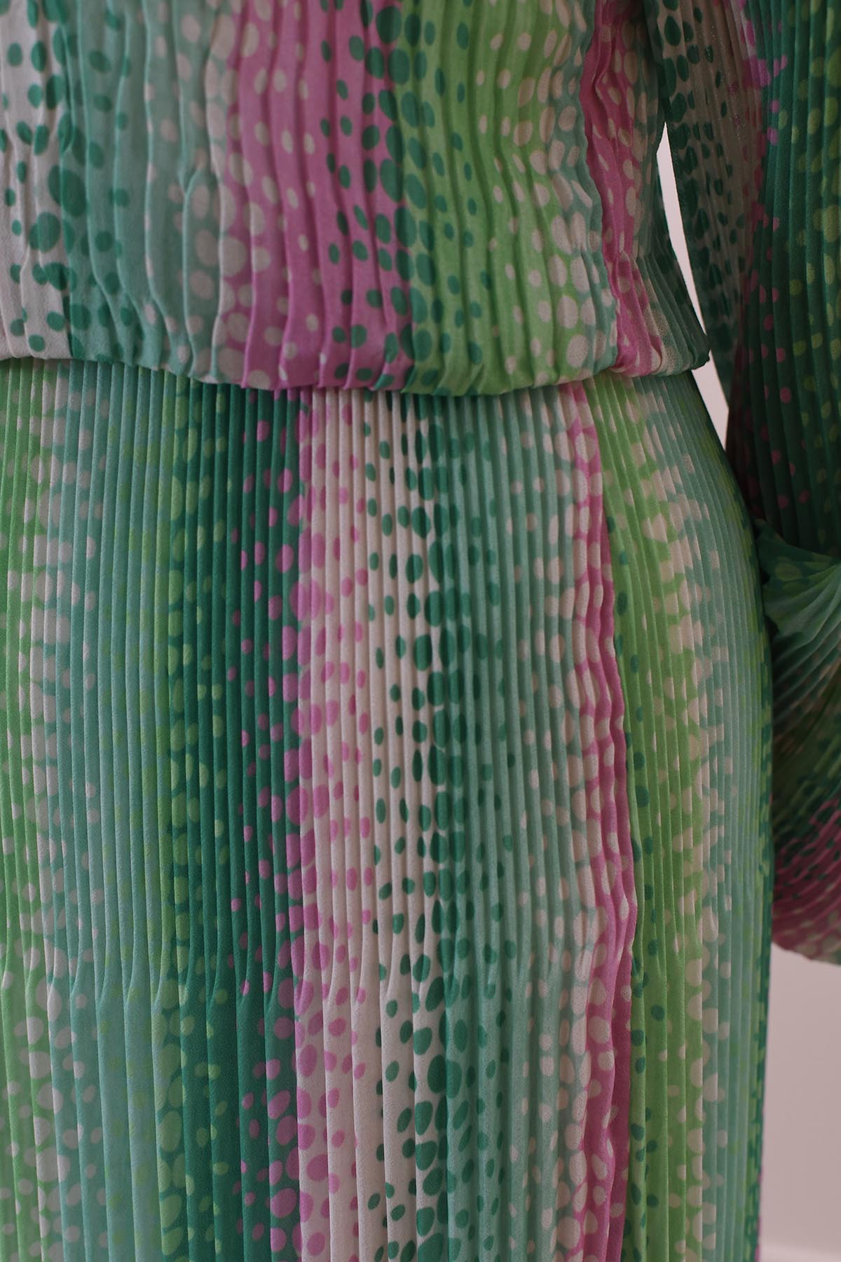 Kyla Multi-Tonal Green & Pink Spot Plisse Dress Description