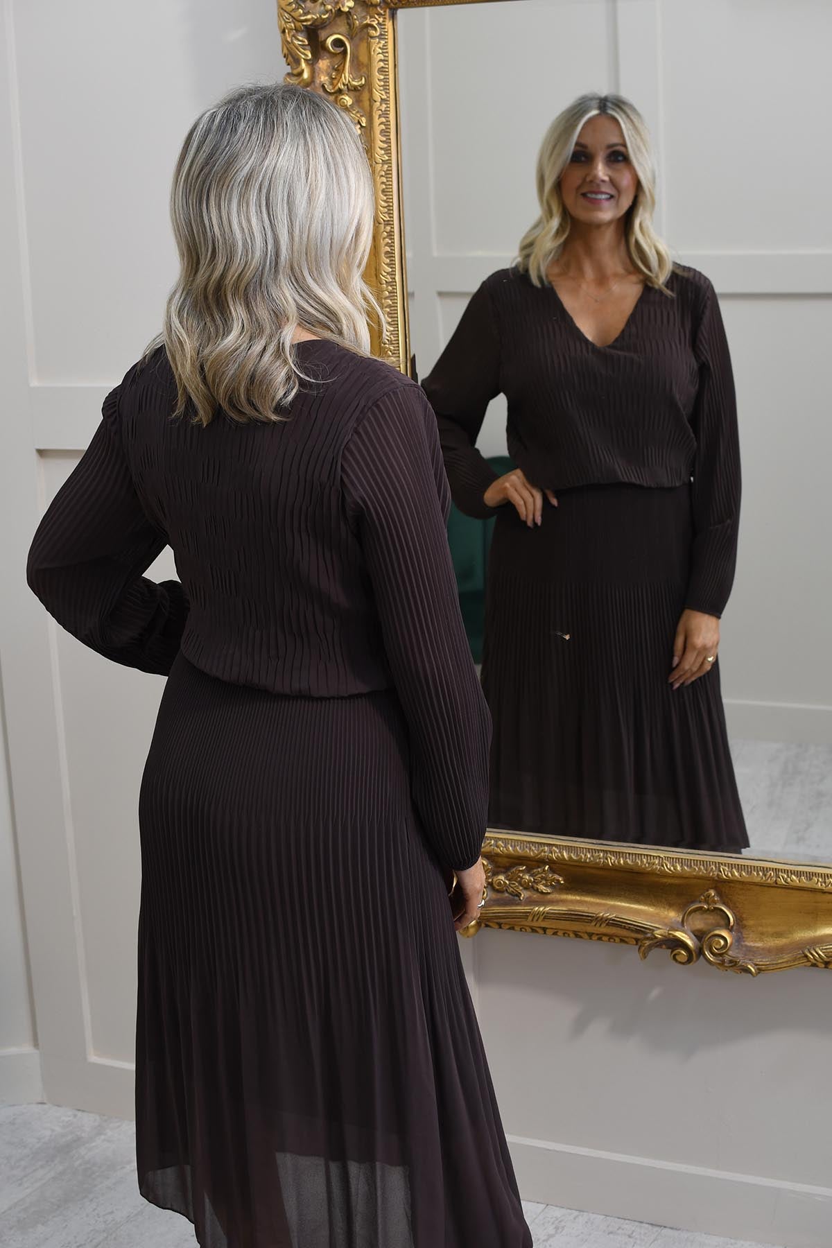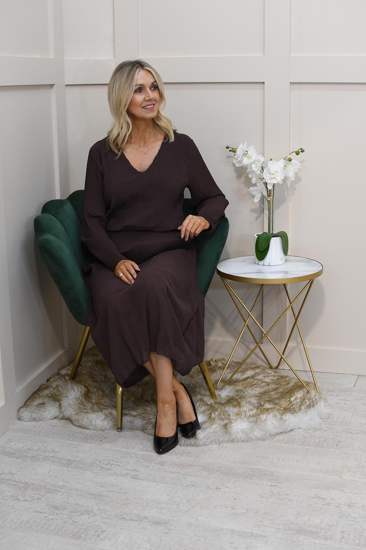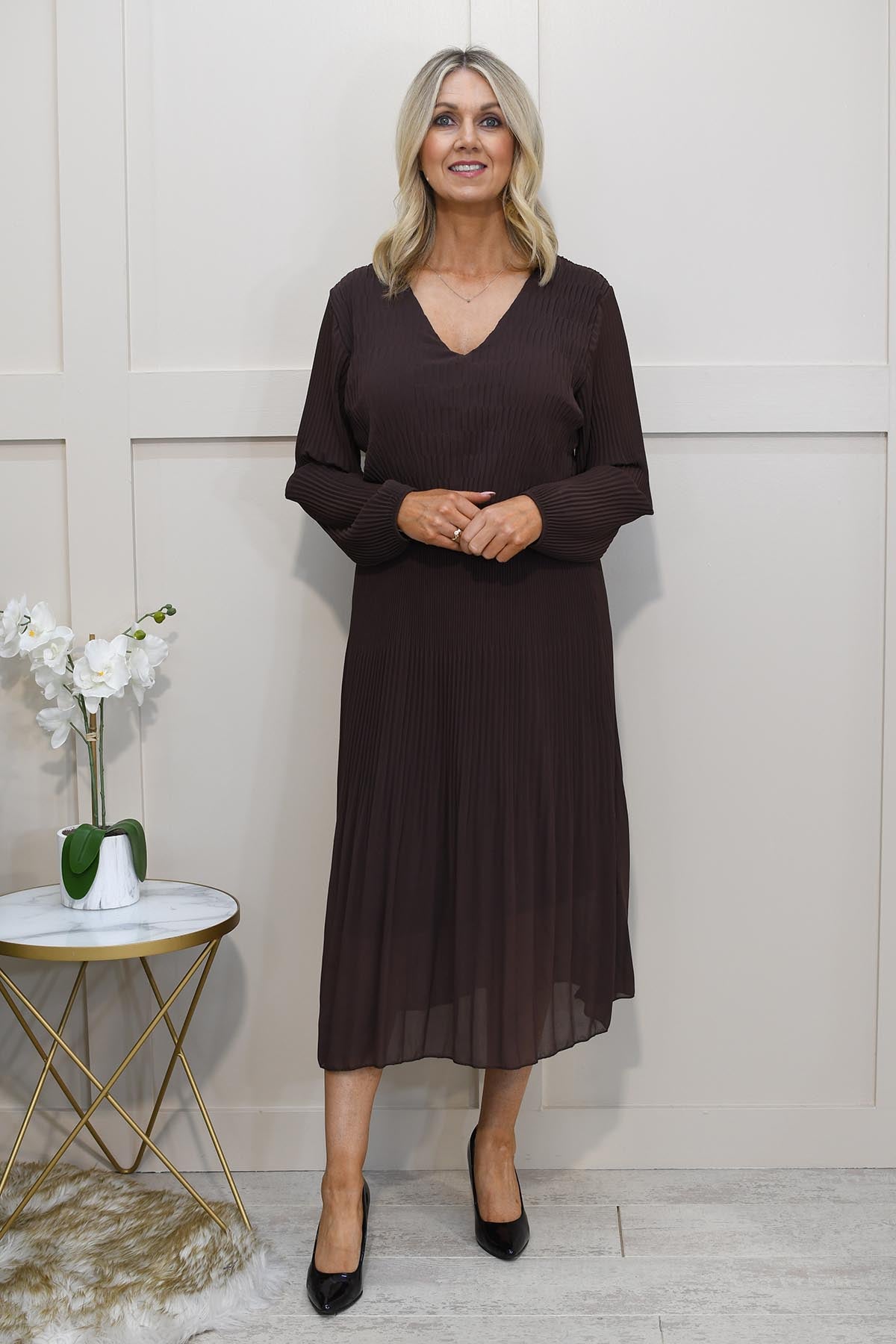 Bring timeless elegance to your wardrobe with the Kyla Plissé Dress in rich chocolate brown. Crafted from 95% viscose and 5% elastane, it offers breathable softness with gentle stretch for comfort and a flattering fit. The plissé texture adds depth and movement, creating a sophisticated silhouette that flows beautifully with every step. Effortlessly versatile, this dress can be styled for both daytime chic and evening elegance—perfect with boots and a jacket for casual wear or heels and jewellery for special occasions. A wardrobe must-have for women who love refined styles with a modern, textured finish.