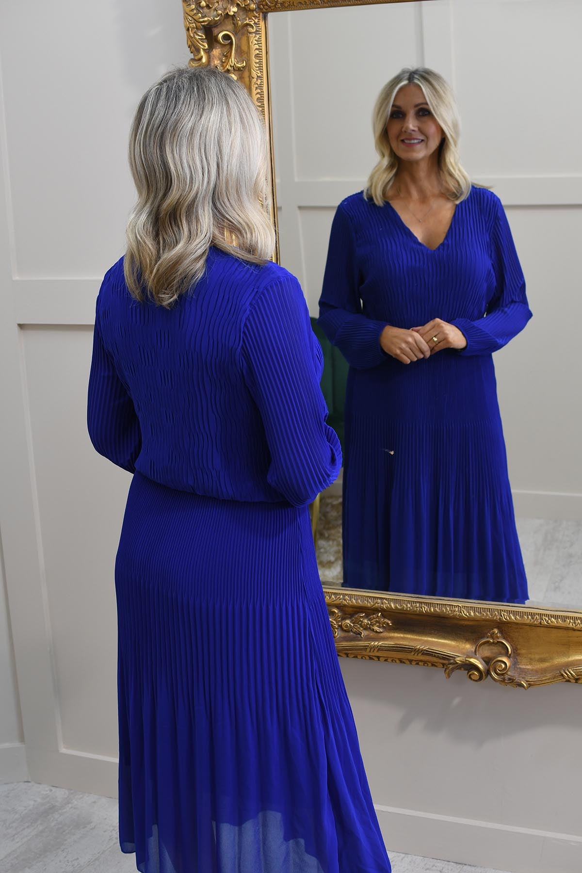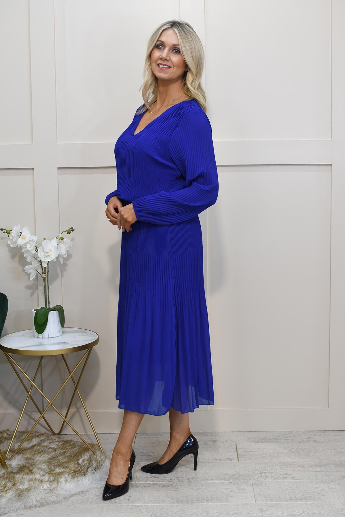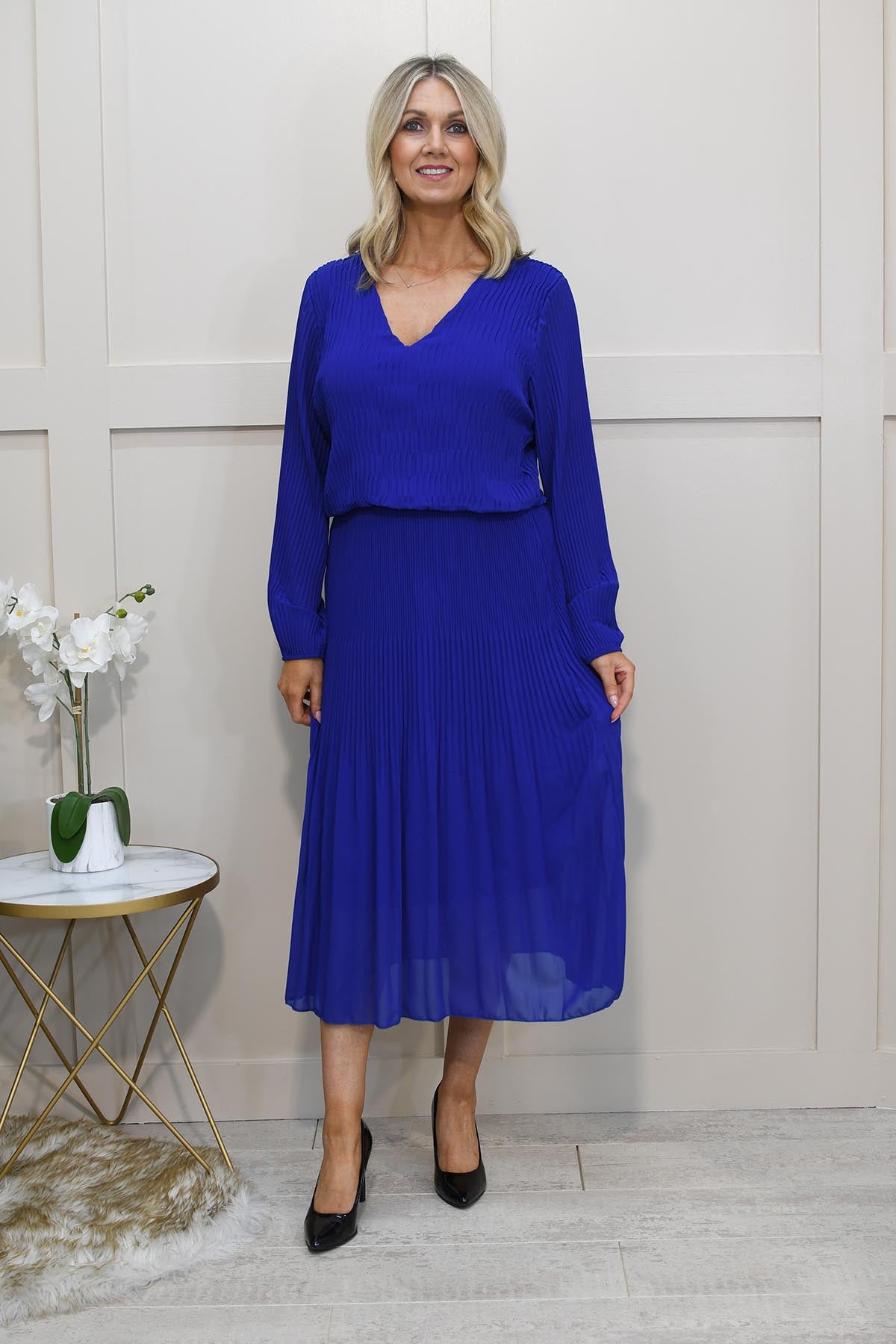 Bring timeless elegance to your wardrobe with the Kyla Plissé Dress in royal blue. Crafted from 95% viscose and 5% elastane, it offers breathable softness with gentle stretch for comfort and a flattering fit. The plissé texture adds depth and movement, creating a sophisticated silhouette that flows beautifully with every step. Effortlessly versatile, this dress can be styled for both daytime chic and evening elegance—perfect with boots and a jacket for casual wear or heels and jewellery for special occasions. A wardrobe must-have for women who love refined styles with a modern, textured finish.