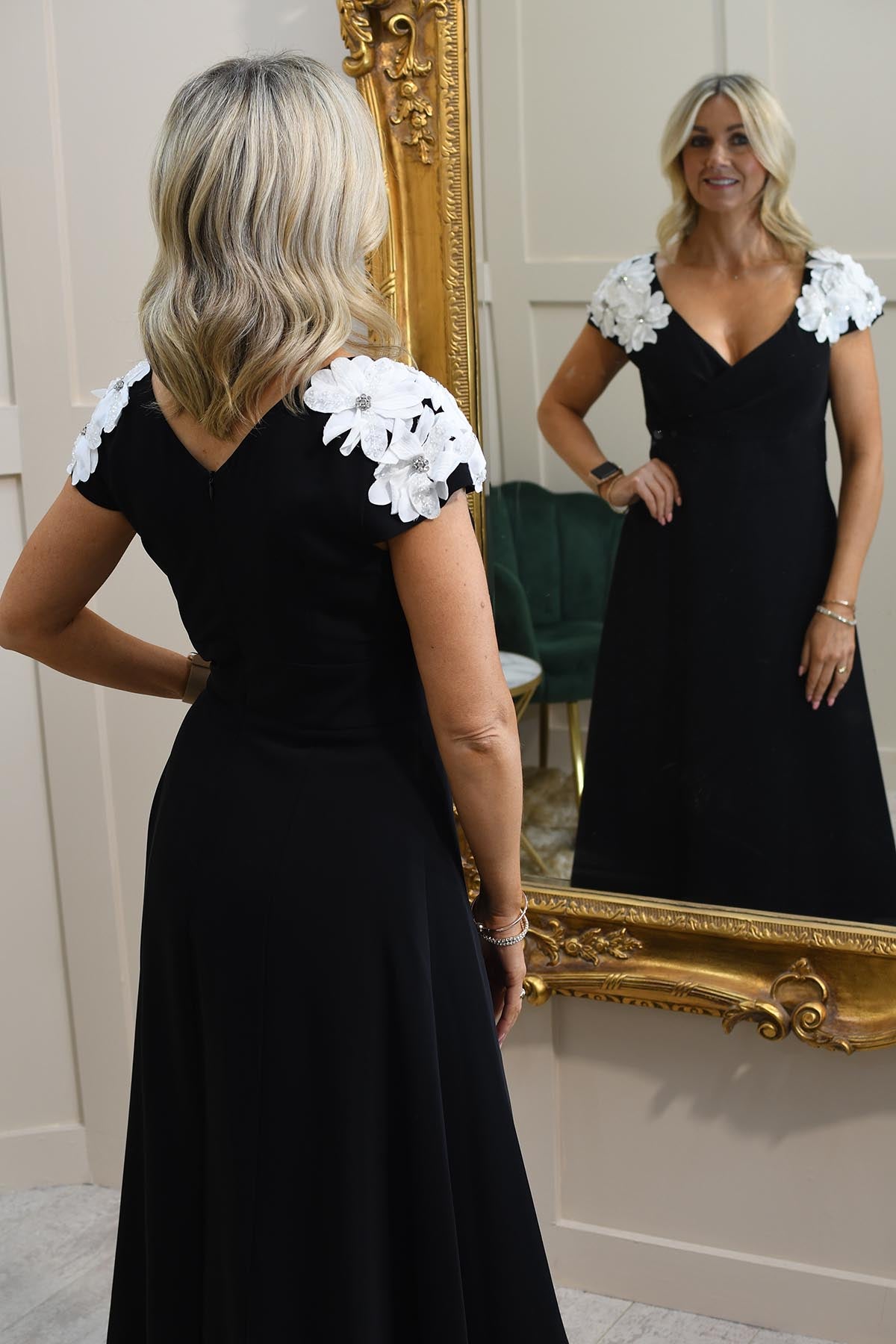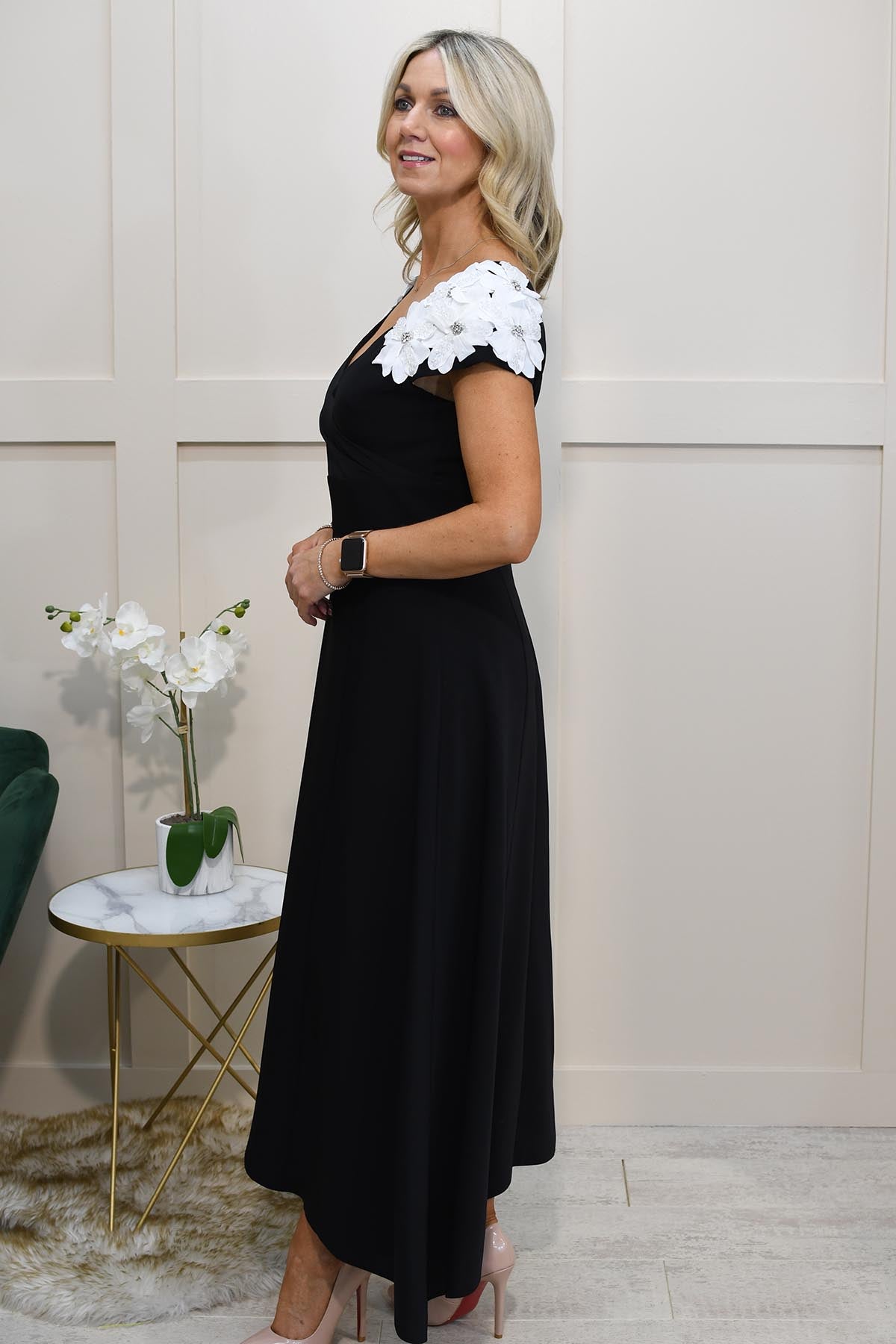 Elevate your evening look with the Lizabella Black V-Neck Dress, a stunning piece that combines sophistication with a touch of romance. The classic black colour creates a timeless silhouette, while the flattering V-neckline adds a chic and feminine touch. The eye-catching shoulder flower detail brings an unexpected yet elegant flair, transforming this dress into a true statement piece. Crafted from high-quality fabric, this dress offers both comfort and style, making it perfect for any special occasion or evening event where you want to stand out in refined elegance.