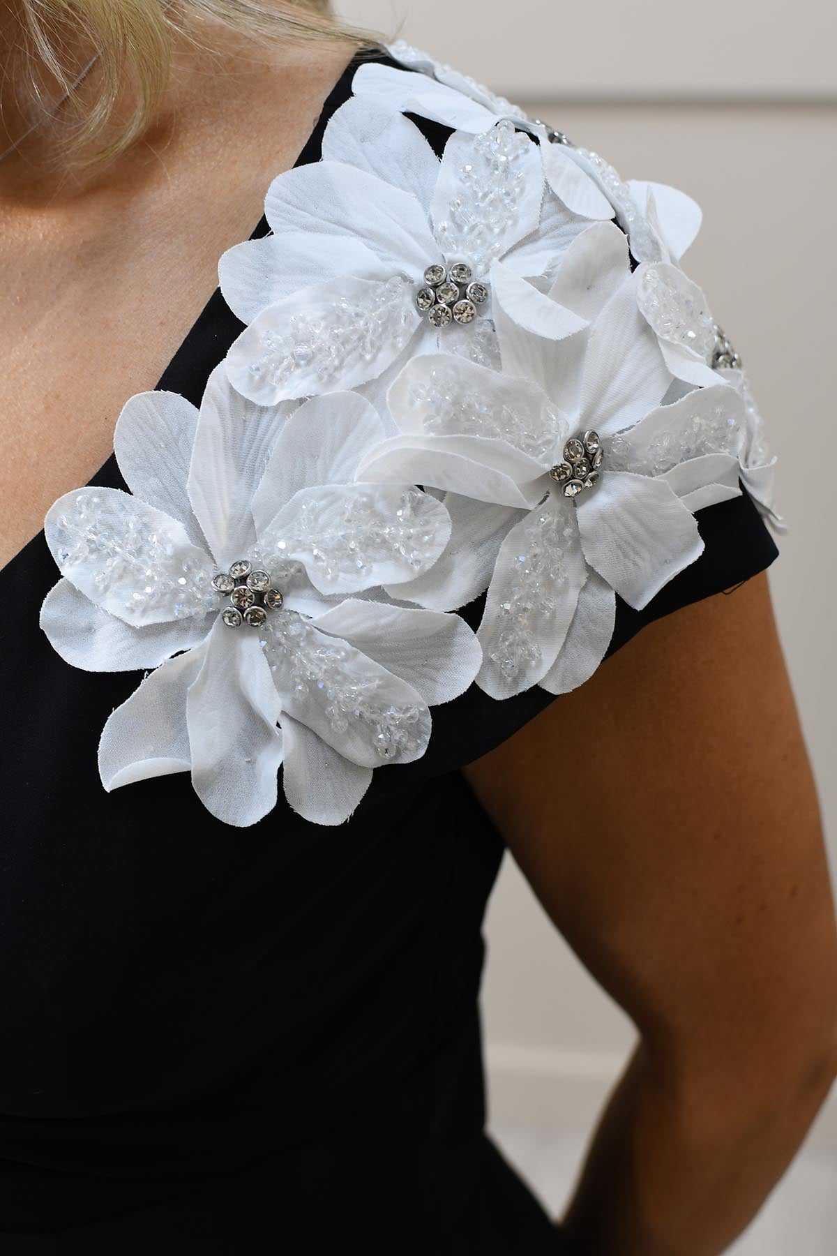 Lizabella Black V Neck Dress With Shoulder Flower Detail -L-25SS-2093-40