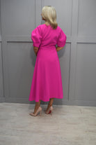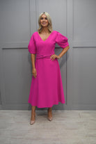 Lizabella Hot Pink Dress with Ruched Waist Detail & Pleated Puff Sleeve - L-24SS-2910-40