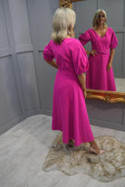 Introducing the epitome of feminine charm and contemporary flair: the Lizabella Hot Pink Dress with Ruched Waist Detail & Pleated Puff Sleeve. This exquisite garment combines boldness with elegance, offering a captivating silhouette that exudes confidence and sophistication.