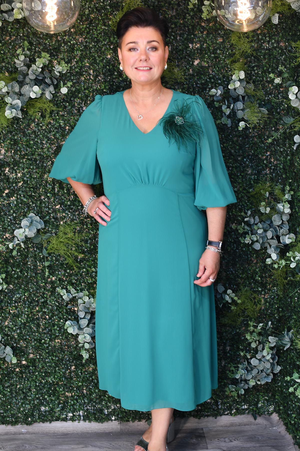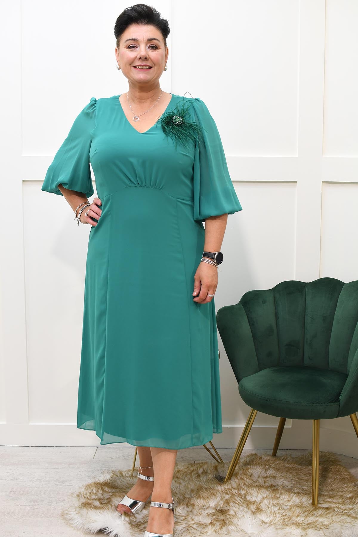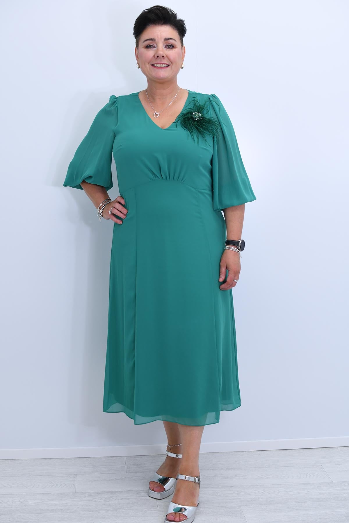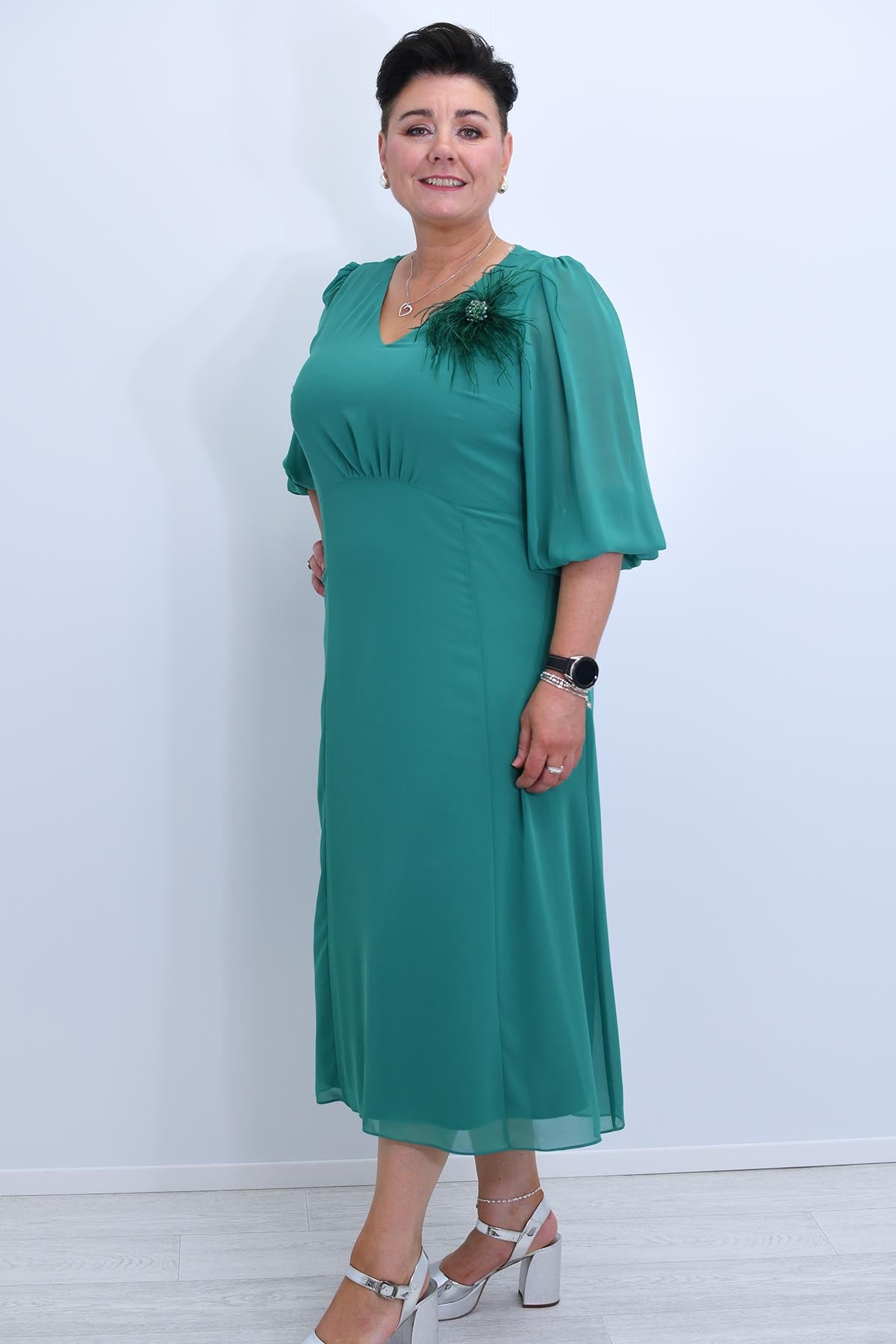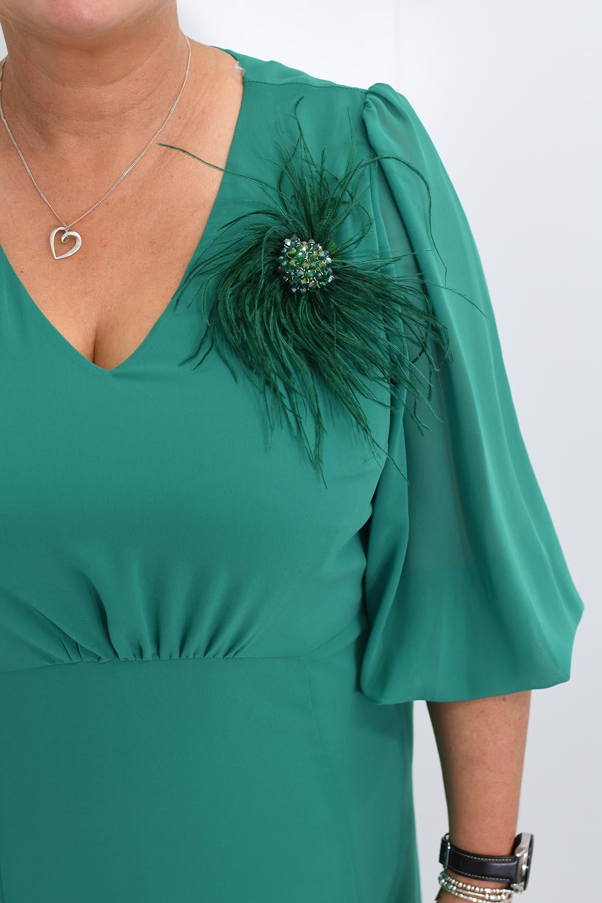Lizabella Jade Green V Neck Dress With Feather Brooch-L-24AW-2972-20