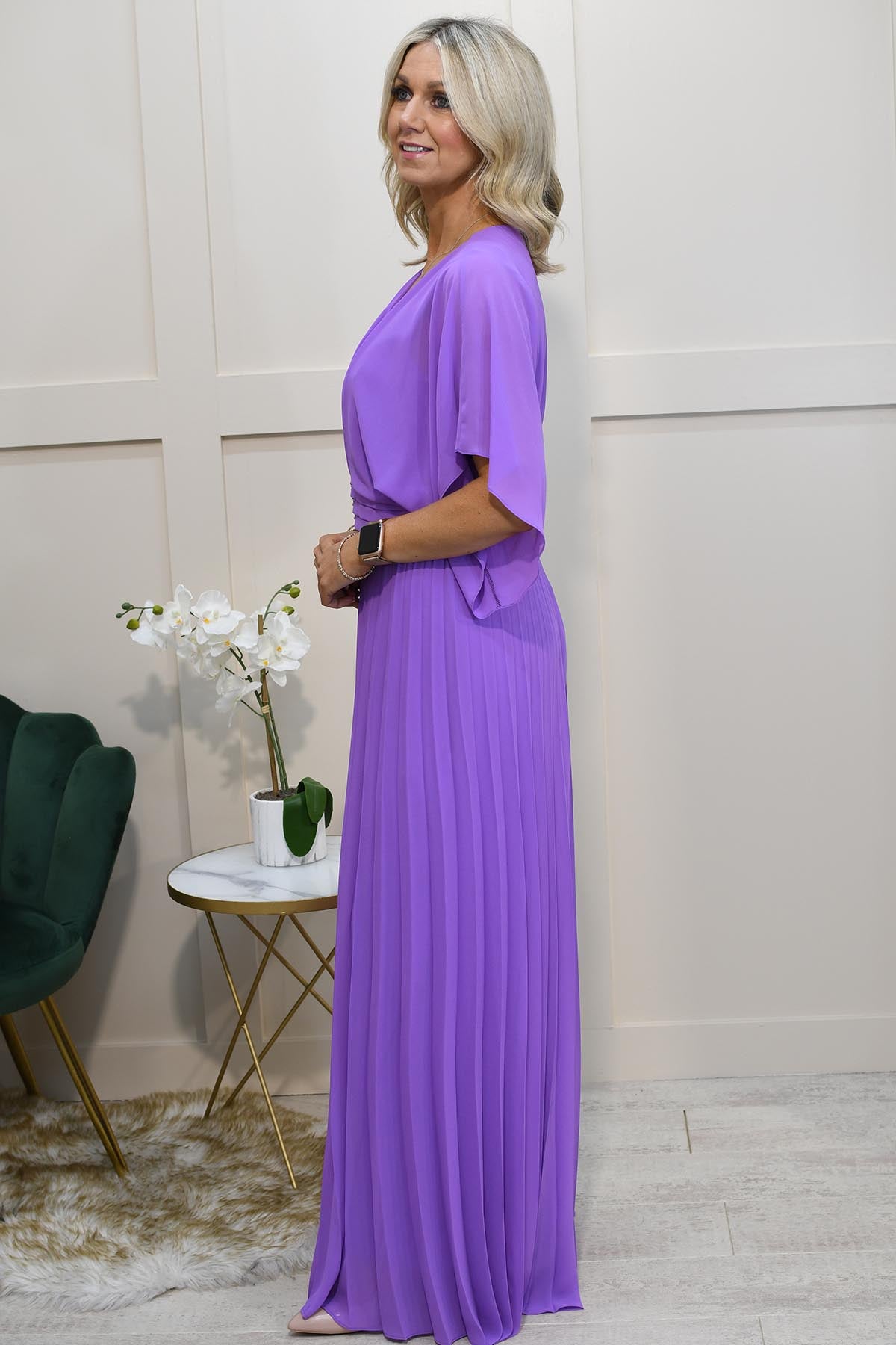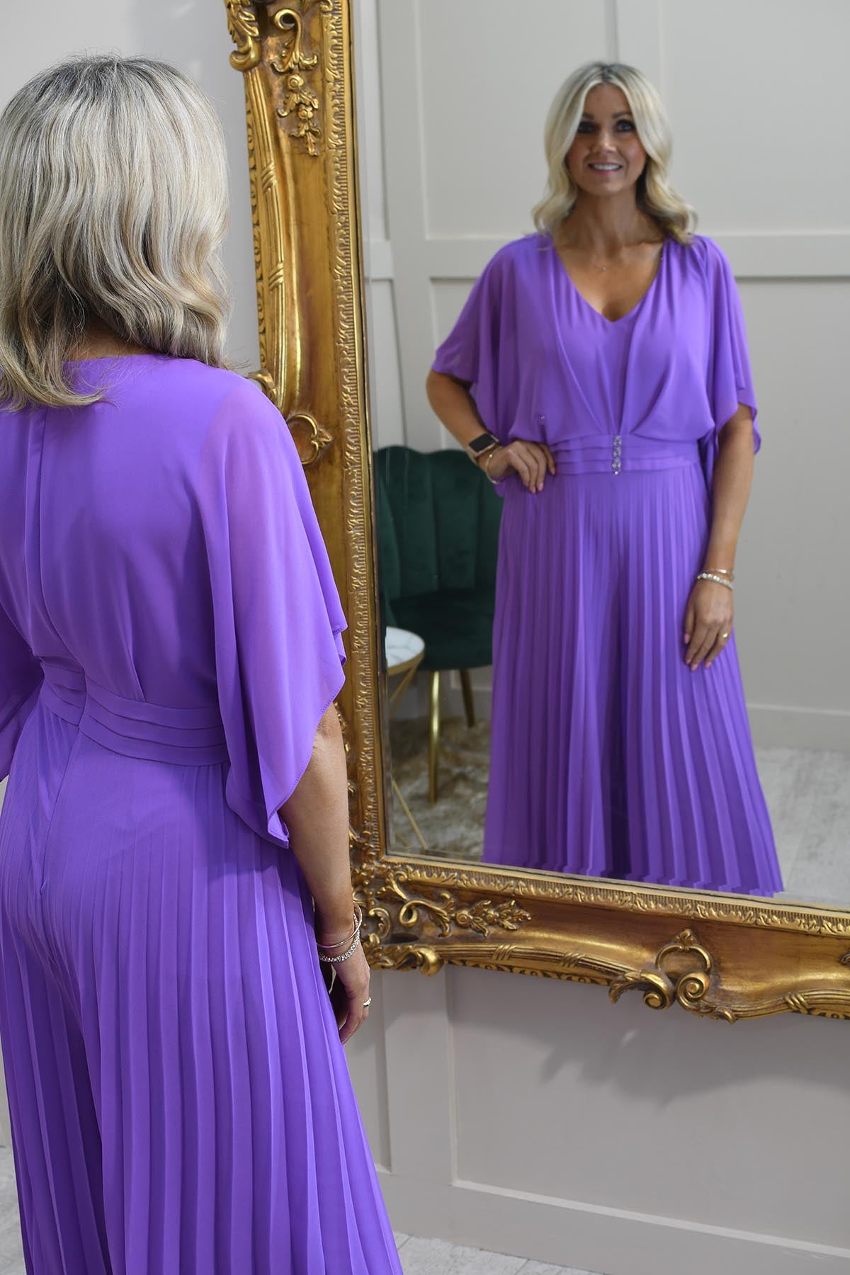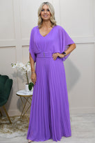 The Lizabella Violet Plisse Jumpsuit with Waterfall Sleeve is a sophisticated and stylish choice for wedding guests. Made from 100% polyester, this formal jumpsuit combines comfort with a flattering fit. The elegant plisse fabric creates texture and movement, while the dramatic waterfall sleeves add a touch of refinement and flow to the silhouette. The vibrant violet colour ensures you make a statement at any event. Ideal for those looking for something beyond the traditional dress, this jumpsuit exudes modern sophistication with timeless appeal.