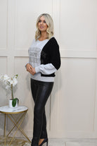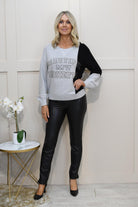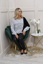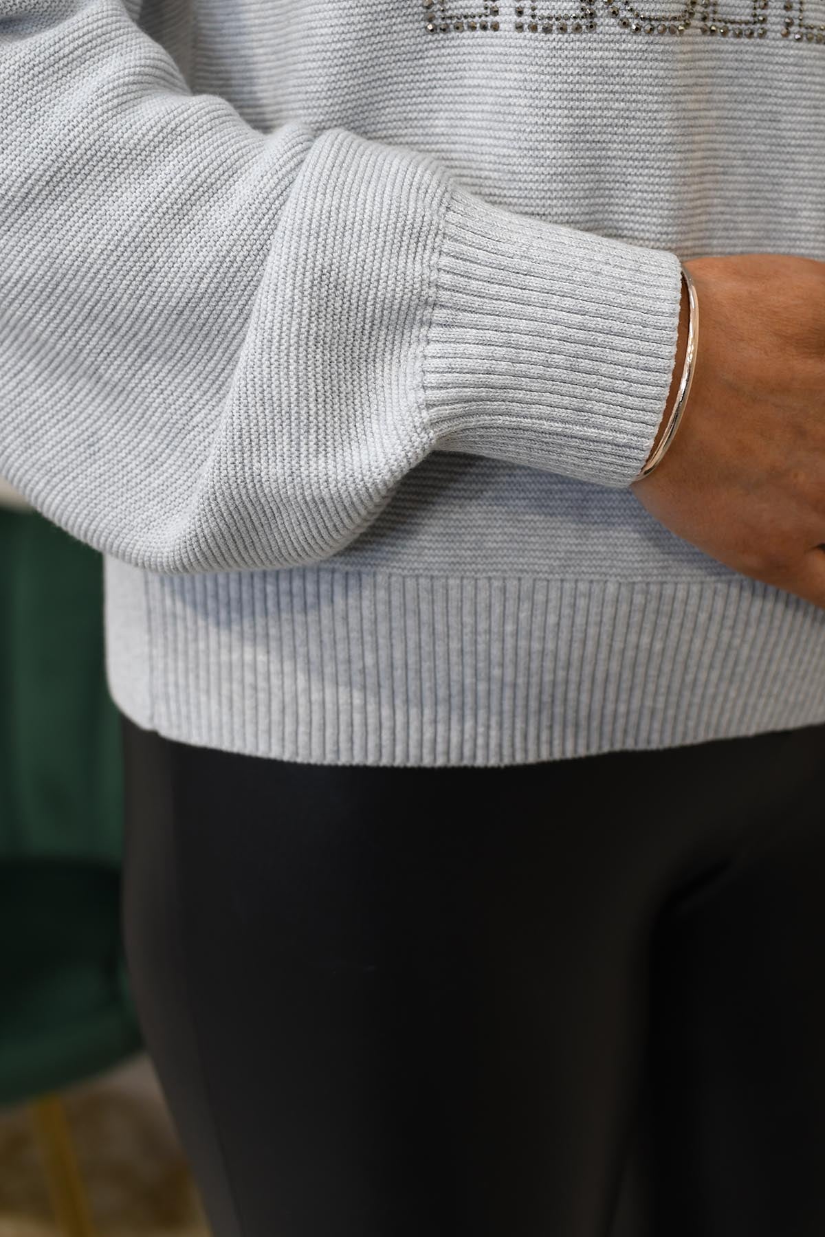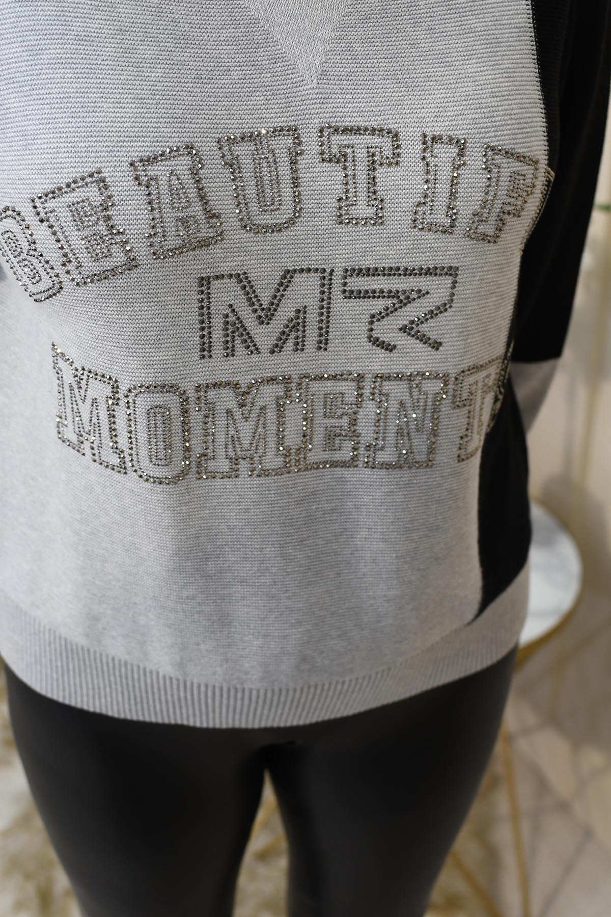 Elevate your casual wardrobe with this Monari ash grey and black melange sweater, crafted from 100% cotton for a breathable and soft feel against the skin. Designed with a relaxed fit, it features a sparkling diamante "Beautiful Moments" slogan, adding a touch of glamour to everyday wear. The versatile melange design makes it easy to pair with jeans, trousers, or skirts, ensuring endless styling possibilities. Perfect for weekend outings, coffee dates, or relaxed evenings, this sweater balances comfort with chic detailing. A must-have knit for those who want casual fashion with a subtle sparkle that transitions seamlessly through the seasons.