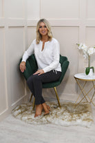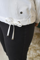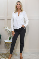 Elevate your everyday style with the Monari off-white blouse featuring stud and drawstring detail, from the refined African Ranch collection. Crafted from a smooth blend of 92% viscose and 8% elastane, this blouse offers a soft, breathable feel with a comfortable stretch for all-day wear. Subtle metallic stud accents add a touch of modern edge, while the adjustable drawstring hem allows for a flattering, custom fit. The clean off-white shade makes it a versatile piece, perfect for both casual and smart-casual occasions. This blouse is the ultimate blend of elegance, comfort, and contemporary detail.