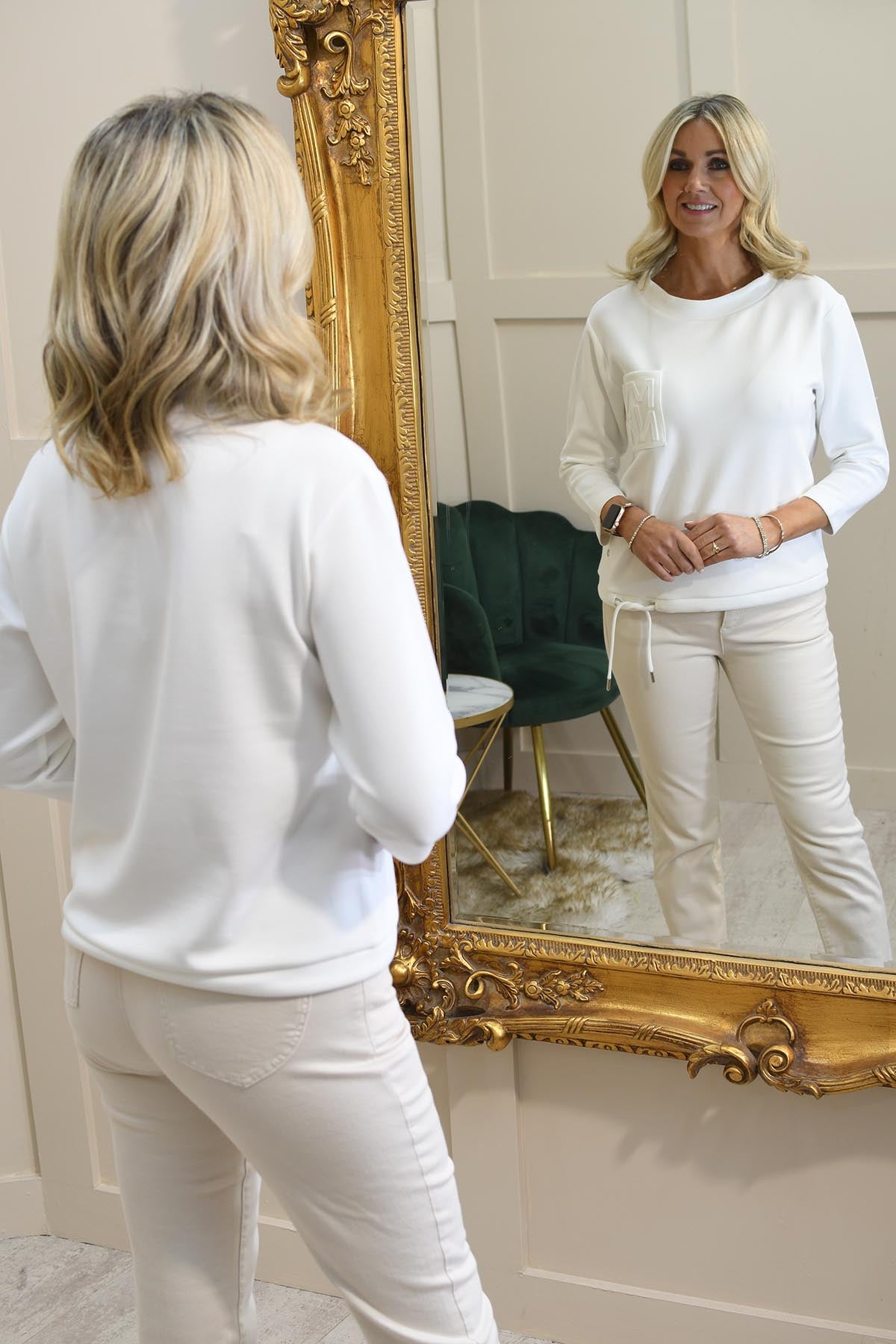 Add a touch of effortless luxury to your casual wardrobe with the Monari Off-White Sweatshirt With 'MN' Pocket Detail from the Seaside Couture Collection. Crafted from a soft, breathable fabric blend, this sweatshirt offers exceptional comfort with a relaxed yet flattering fit. The minimalist off-white design is elevated by the stylish 'MN' logo pocket detail, adding a subtle touch of Monari’s signature elegance. Featuring a classic round neckline, long sleeves, and ribbed trims, it’s perfect for layering or wearing solo. Pair it with jeans or joggers for a chic and versatile everyday look.
