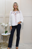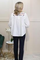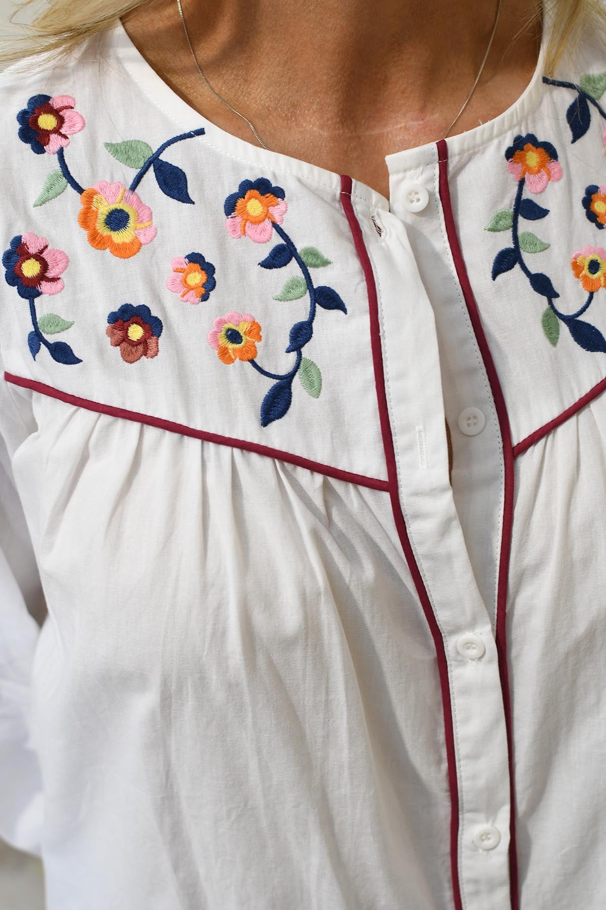 Musy Muse White Shirt With Floral Embroidered Detail & Berry Trim-M637-1