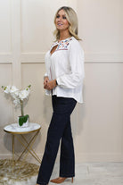 The Musy Muse White Shirt With Floral Embroidered Detail & Berry Trim is a stylish and feminine piece that adds a sophisticated touch to any wardrobe. Crafted from high-quality fabric, this crisp white shirt features intricate floral embroidery, bringing a delicate and artistic charm to the design. The berry-coloured trim around the collar and cuffs provides a striking contrast, enhancing the shirt’s overall appeal. Perfect for both casual and semi-formal occasions, this versatile shirt pairs beautifully with jeans, skirts, or trousers. Its elegant design and thoughtful details make it a must-have addition for effortless, chic styling.
