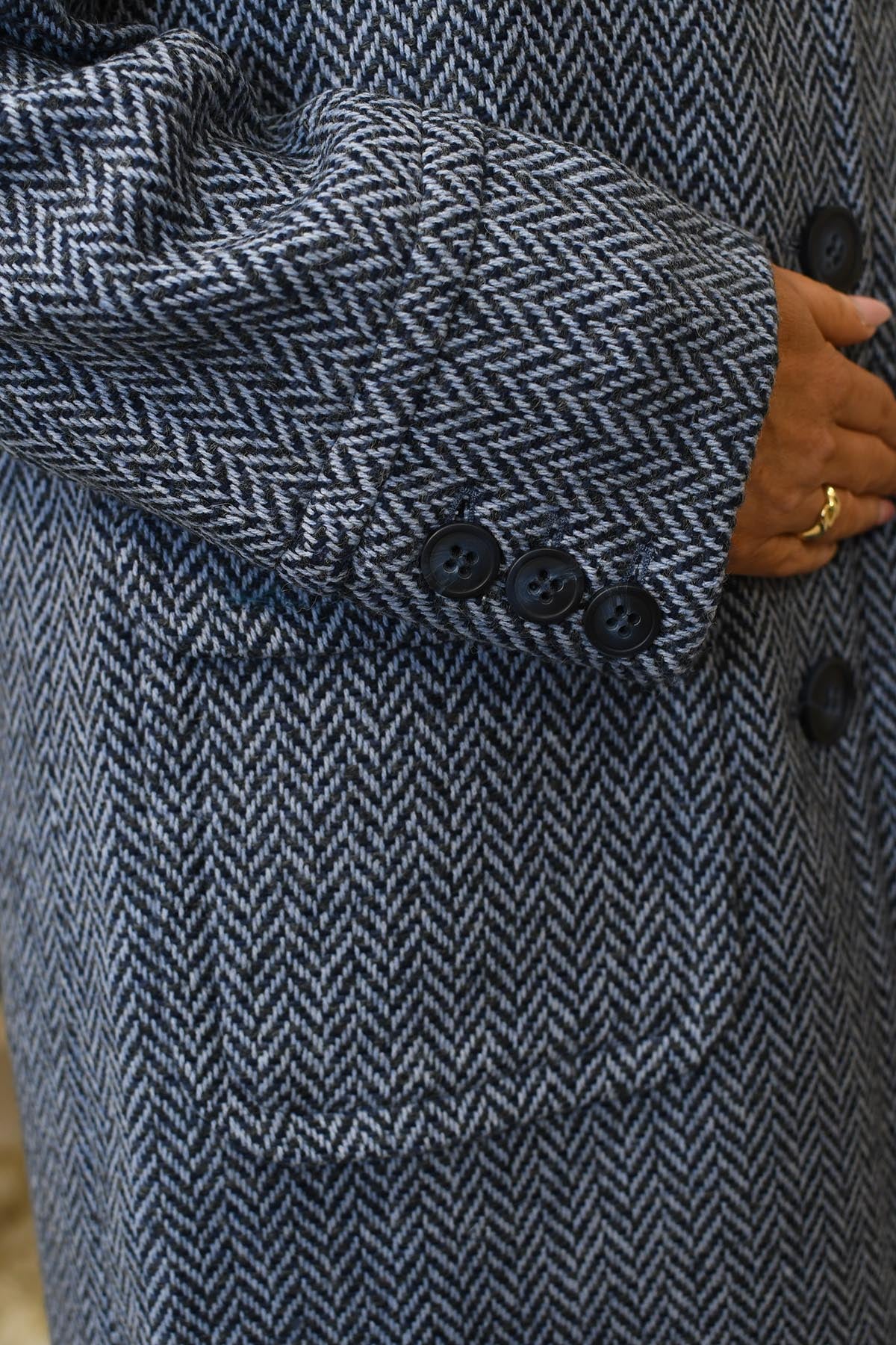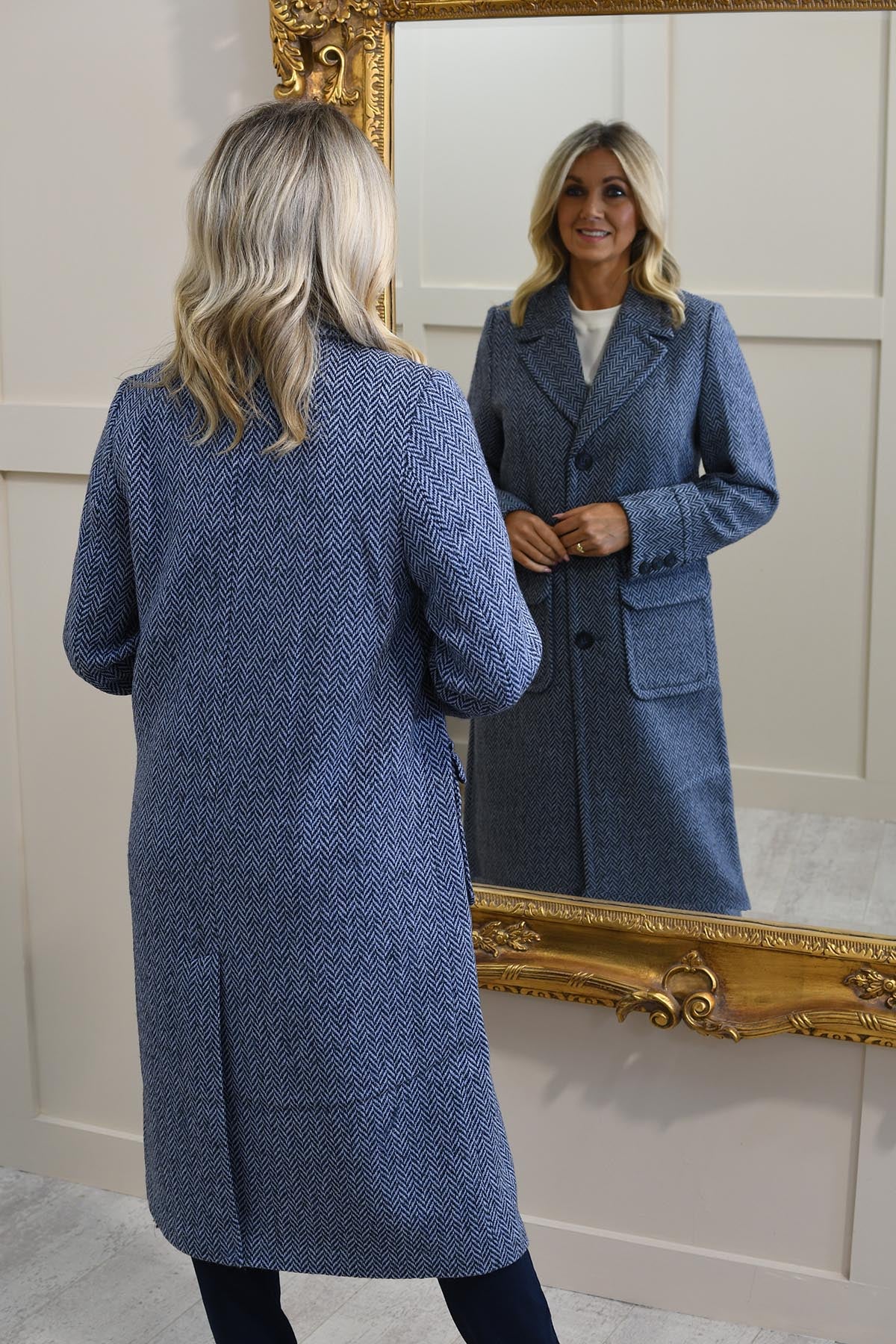 Wrap up in style with this multi-tonal blue chevron duster coat from Olsen, a statement outerwear piece designed for both warmth and elegance. Expertly crafted from a premium blend of 45% wool, 35% polyester, and 20% acrylic, it offers cozy insulation with durability and a luxurious feel. The striking chevron pattern in layered blue tones adds a modern twist to a timeless silhouette, while the longline duster cut creates a sleek and flattering shape. Perfect for layering over knitwear, trousers, or dresses, this coat transitions seamlessly from day to evening, making it a versatile wardrobe essential for cooler seasons.