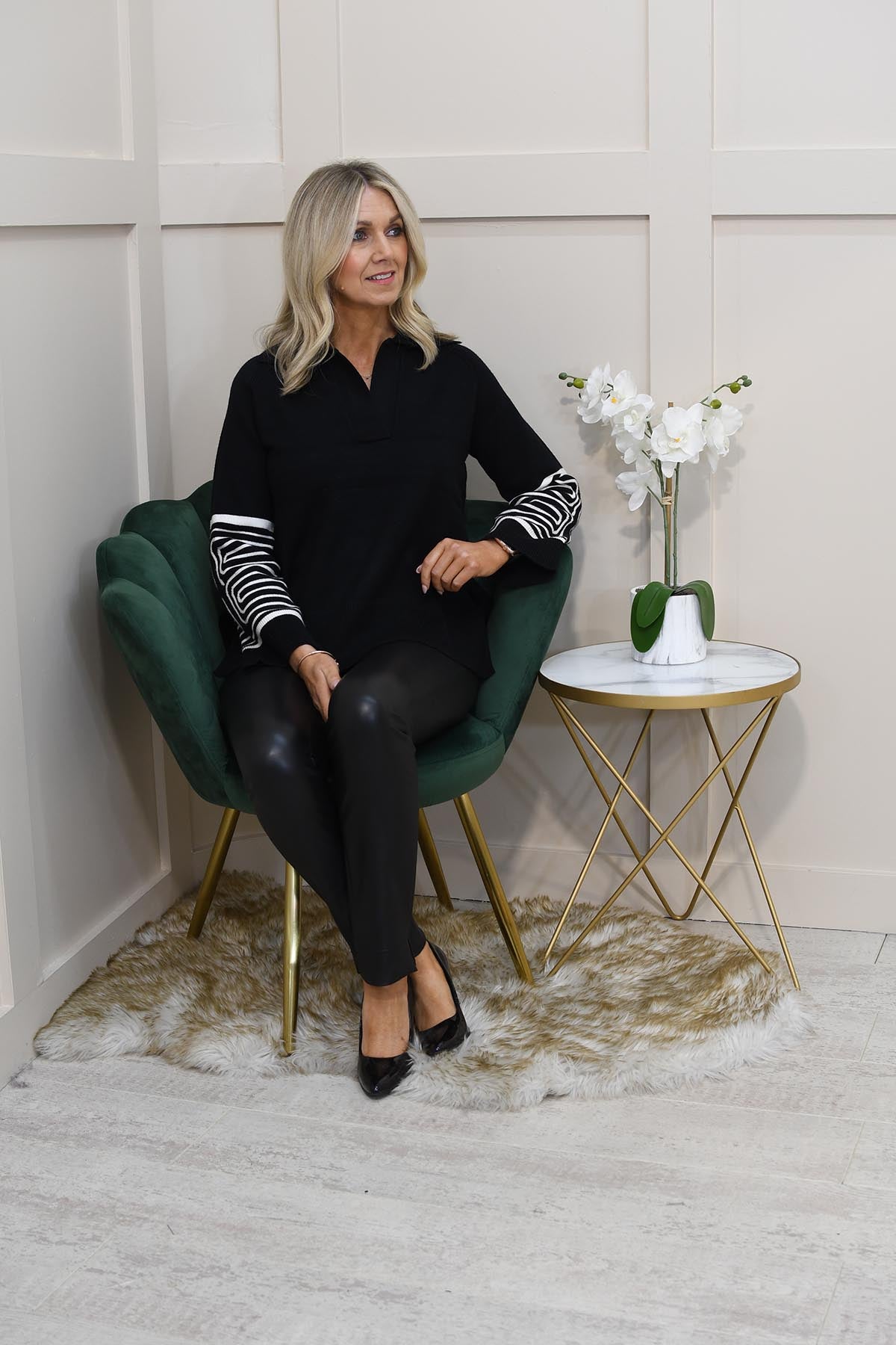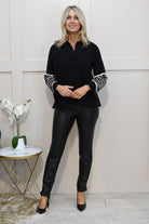 Elevate your everyday wardrobe with the Pomodoro Jacquard Print Sleeve Jumper in timeless black. Crafted from 46% viscose, 30% polyester, and 24% polyamide, it offers a soft, breathable feel with durability and stretch for all-day comfort. The classic silhouette is refreshed with striking jacquard print sleeves, adding depth, texture, and a stylish contrast to the solid body. Perfect for dressing up or down, this jumper pairs effortlessly with jeans for a chic casual look or tailored trousers for smart-casual styling. A versatile staple, it blends comfort and sophistication—ideal for women who love knitwear with distinctive detailing.