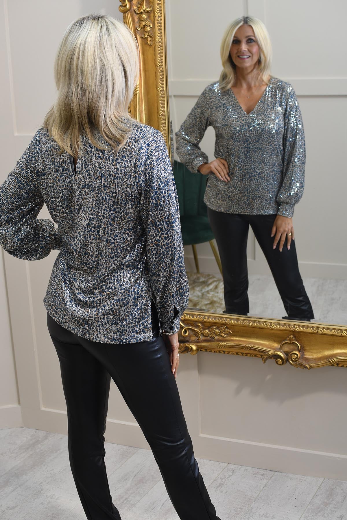Pomodoro Teal and Silver V Neck Sequin Top - 62451A