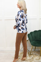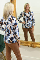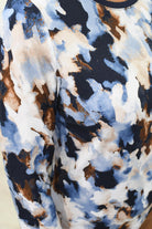 Infuse your wardrobe with artistic flair through the Rabe Navy, Powder Blue & Bronze Paint Effect Top. This unique piece showcases an eye-catching paint effect design in a sophisticated palette of navy, powder blue, and bronze. The abstract pattern mimics the strokes of a modern painting, creating a dynamic and elegant visual impact.