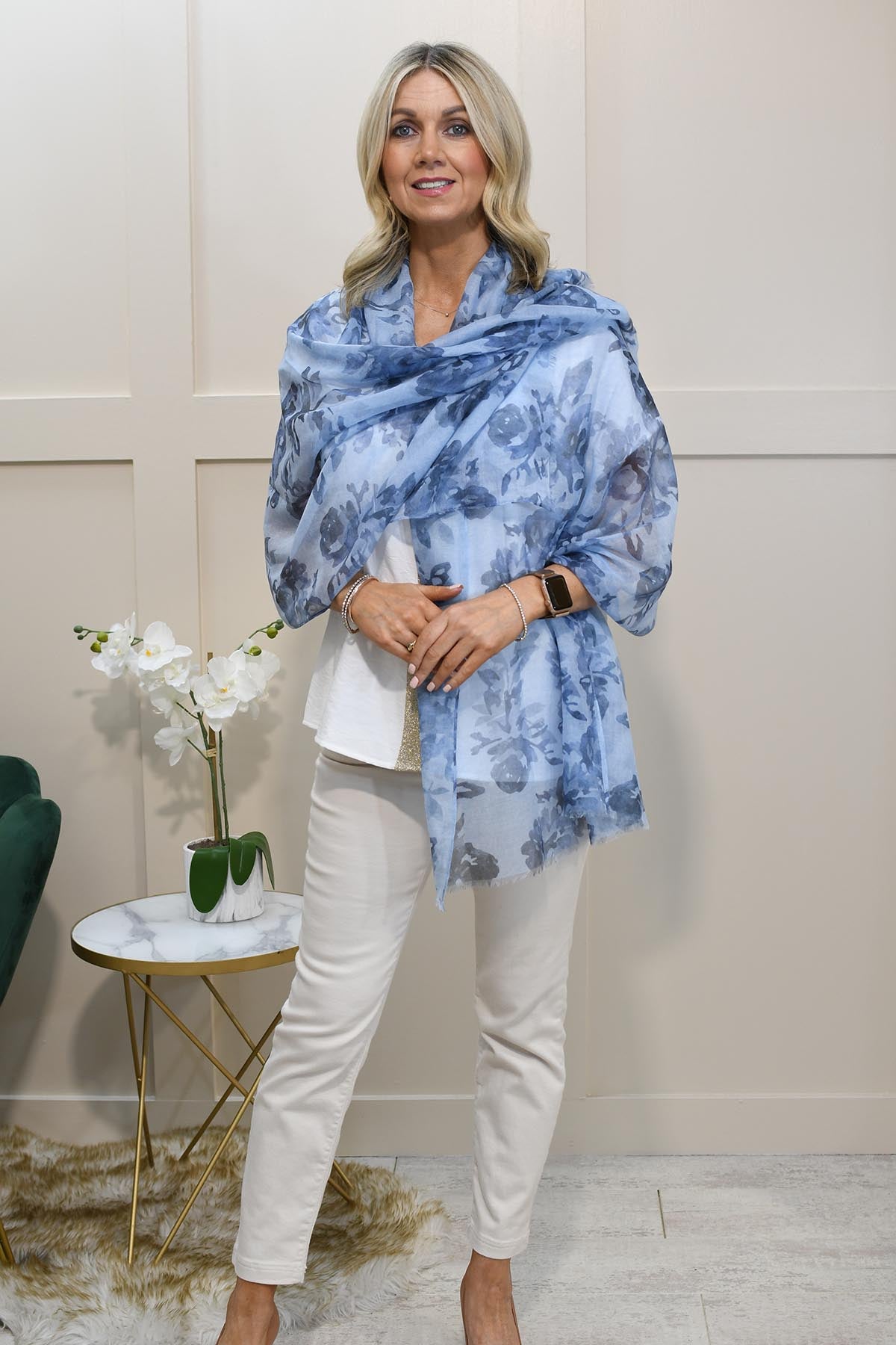 Add a touch of elegance to any outfit with the Rabe Navy Sheer Floral Print Scarf. Crafted from a lightweight, breathable fabric, this scarf drapes beautifully for an effortlessly chic look. The delicate floral print in soft, complementary tones enhances its timeless appeal, while the sheer design adds a touch of femininity and sophistication. Perfect for layering across seasons, this versatile accessory can be worn loosely over the shoulders or wrapped for extra warmth. Whether paired with casual or dressy outfits, this stylish scarf is a must-have addition to your wardrobe.