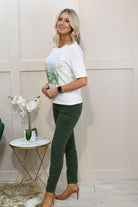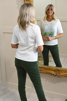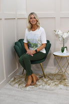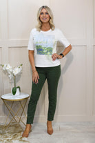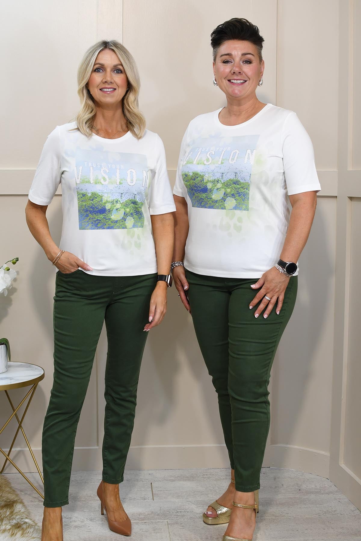 Inspire your everyday style with the Rabe White Top featuring a 'Trust Your Vision' landscape graphic and sparkling diamante detail. Made from a soft and stretchy blend of 95% cotton and 5% elastane, this top offers breathable comfort with a flattering fit. The artistic landscape design adds a creative touch, while the delicate diamante embellishments bring subtle shimmer to your look. Perfect for adding personality to your casual wardrobe, it pairs effortlessly with jeans or tailored trousers. Ideal for relaxed days with a stylish twist.
