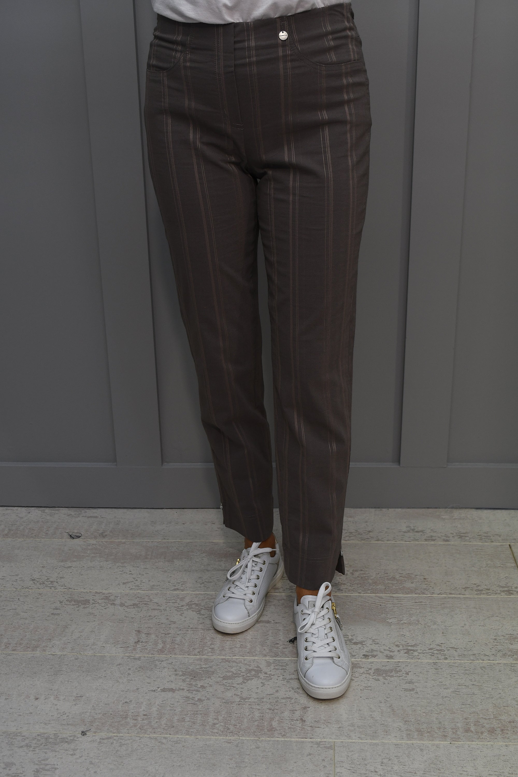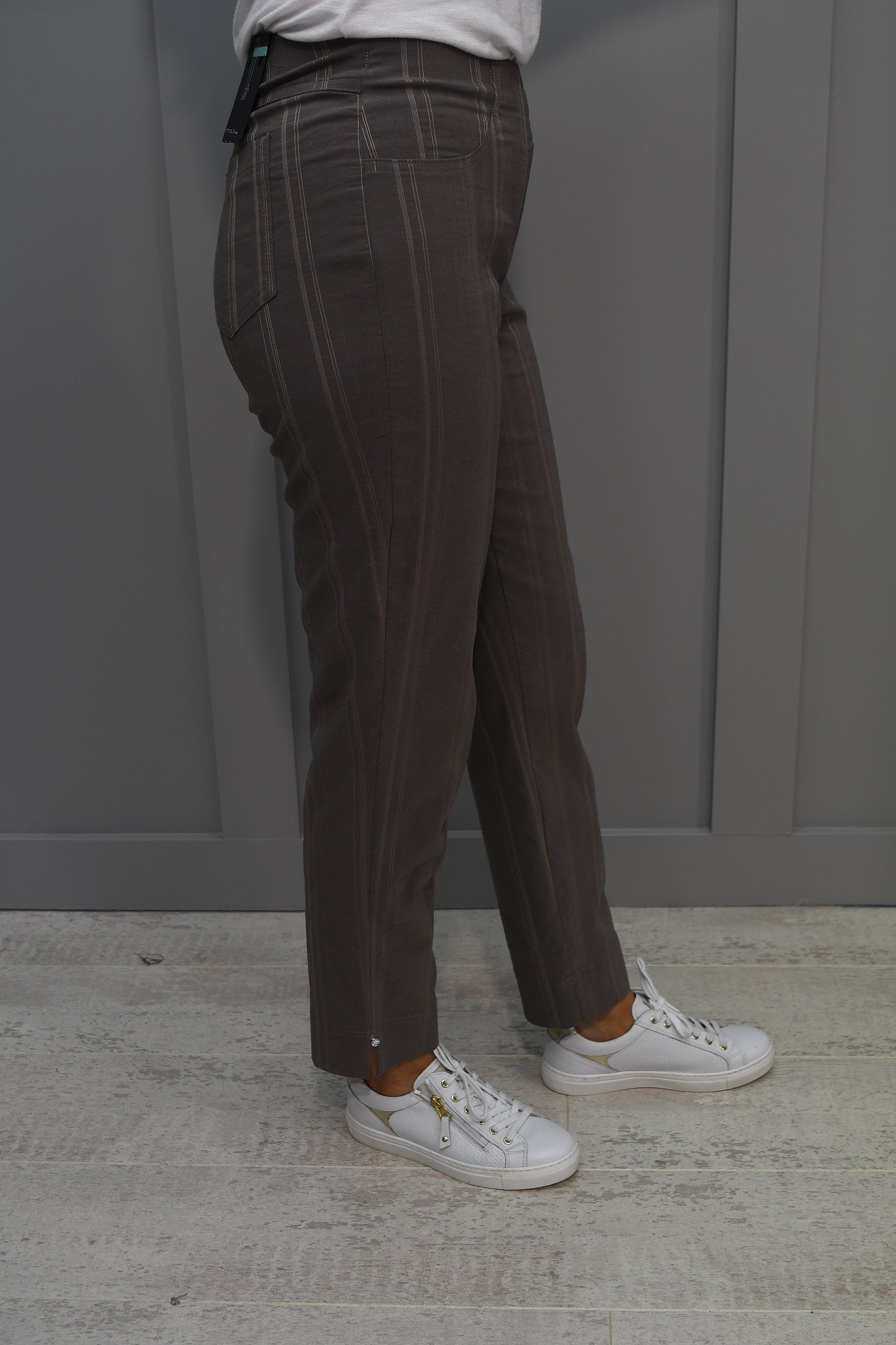 Regardless of what the dress code is, our Robell Dark Taupe Bella 09 Seersucker trousers will keep you on trend. Vertical stripes are a massive trend and with an extremely comfortable pull on design and an elasticated waistband, this will create the perfect shape for your figure and accentuate all your best areas. They are a soft cotton material and are lightweight, but don’t compromise on quality. The Robell Bella 09 Dark Taupe Trousers will be your new go-to item with a flattering fit and slight slit at the ankle. Meeting up with friends for lunch or dinner? Then add a heel and a dressy top and you’re ready for the day ahead! Heading abroad this summer? Pack these into your case and you’re ready for your evening out in the sun. Comfortable and classy, the perfect combination.