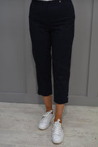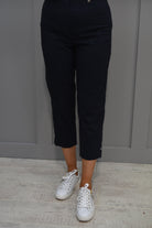 The dark Marie 07 Seersucker Crop Trousers With Diamanté Detail from Robell are a versatile and flattering choice for your summer wardrobe. Cut from a navy material, these slightly cropped, smart trousers are figure-flattering, incredibly wearable and feature a small slit in either ankle with a gem adornment.