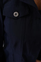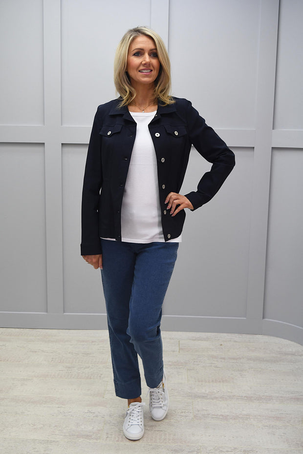 Looking for a classic jacket that goes above and beyond? The Robell Navy Happy Jacket is the perfect choice. With a stylish retro denim-inspired cut and comfortable stretch fabric, it effortlessly combines timeless style with modern comfort. The jacket features a classic collar, long sleeves, and buttoned cuffs, giving it a sophisticated touch. Silver stud buttons down the front add a hint of shine, making it a versatile and chic addition to your wardrobe.