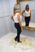 The Robell Marie Navy Patterned Trousers are a definite cert for your wardrobe for the seasons ahead. The beautiful bronze pattern on the navy canvas helps to enhance the colours and the pattern. With an incredibly comfy pull on design, these trousers are an extremely popular item with our customers for Autumn and Winter. A clever seam and a flat elasticated waistband allows these trousers to accentuate your shape. With a slim fit, full length leg and a small split at either side of the ankle, they are the perfect addition to any look you want to create. The Robell Marie Navy Patterned Trousers have been made with a little hint of stretch and they are made from a weightier velvet, perfect for women who want both luxury and warmth in the colder months ahead. The decorative Robell pendant attached to the waistband transform these Robell Marie Navy Patterned Trousers from stylish to superior. High quality and stylish…everything you want in a trouser!