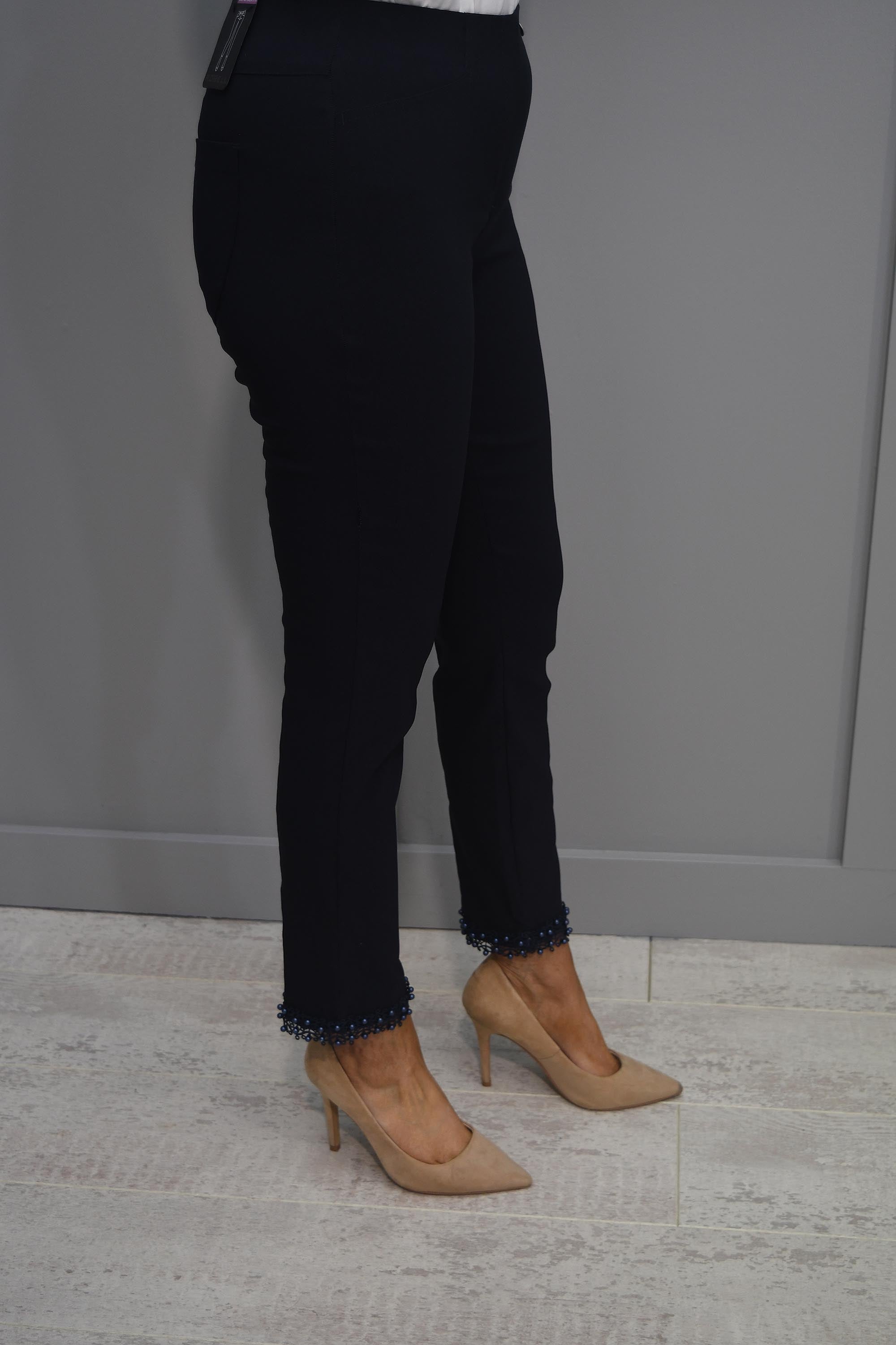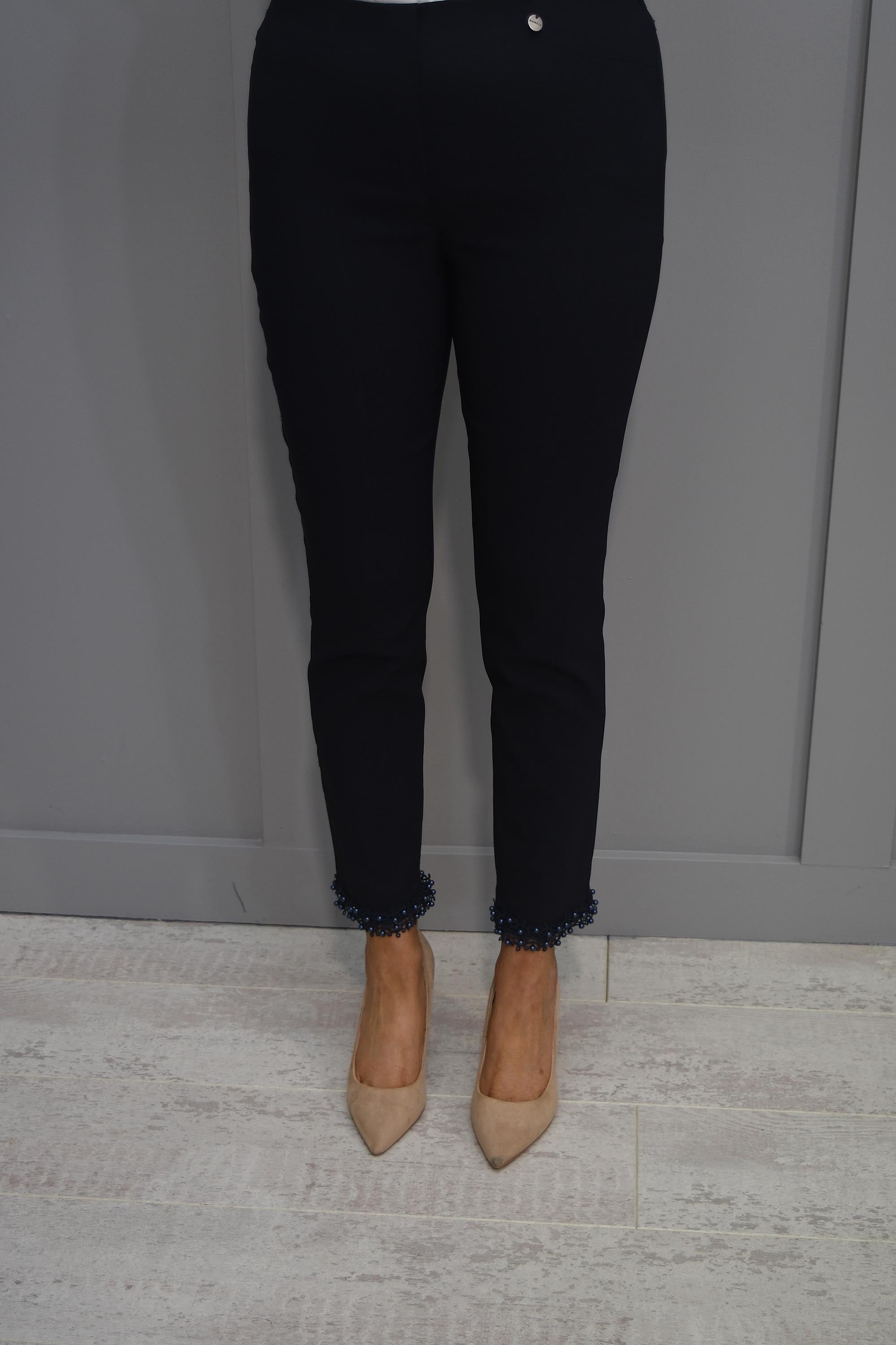 Designed for both style and comfort, these trousers feature a high-quality fabric blend that ensures a luxurious feel and excellent durability. Whether you're dressing for a day at the office or a special event, the Robell Rose 09 Navy Trousers With Pearl Ankle Detail are sure to make a chic statement.