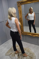 Make a sophisticated statement with the Robell Rose 09 Navy Trousers featuring Pearl Ankle Detail. Crafted with exquisite attention to detail, these trousers seamlessly blend timeless elegance with modern flair.