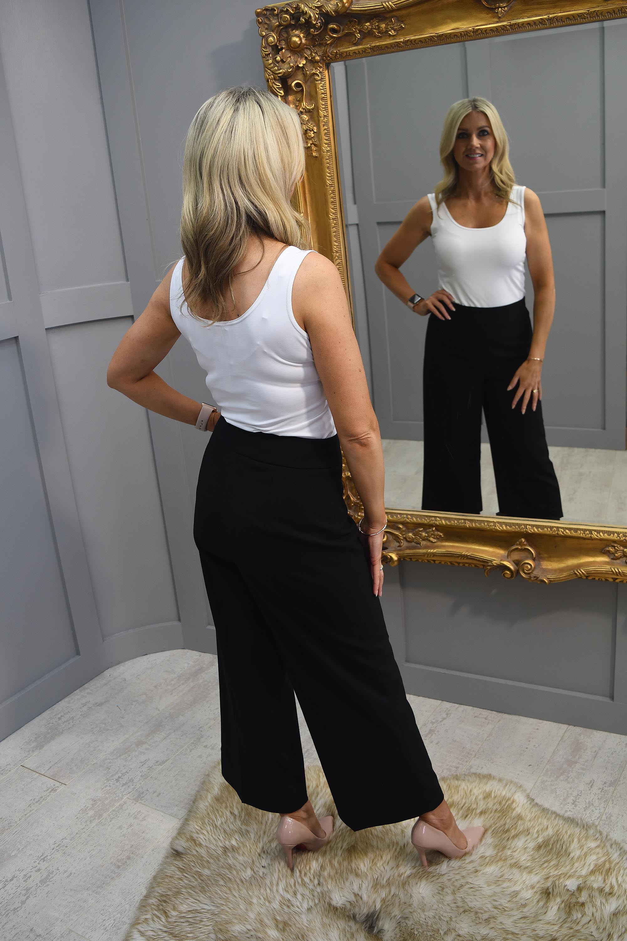 One of the standout features of these trousers is the wide waistband. The waistband sits comfortably on the hips, providing a secure and flattering fit. The wide waistband also helps to create a smooth and streamlined look.
