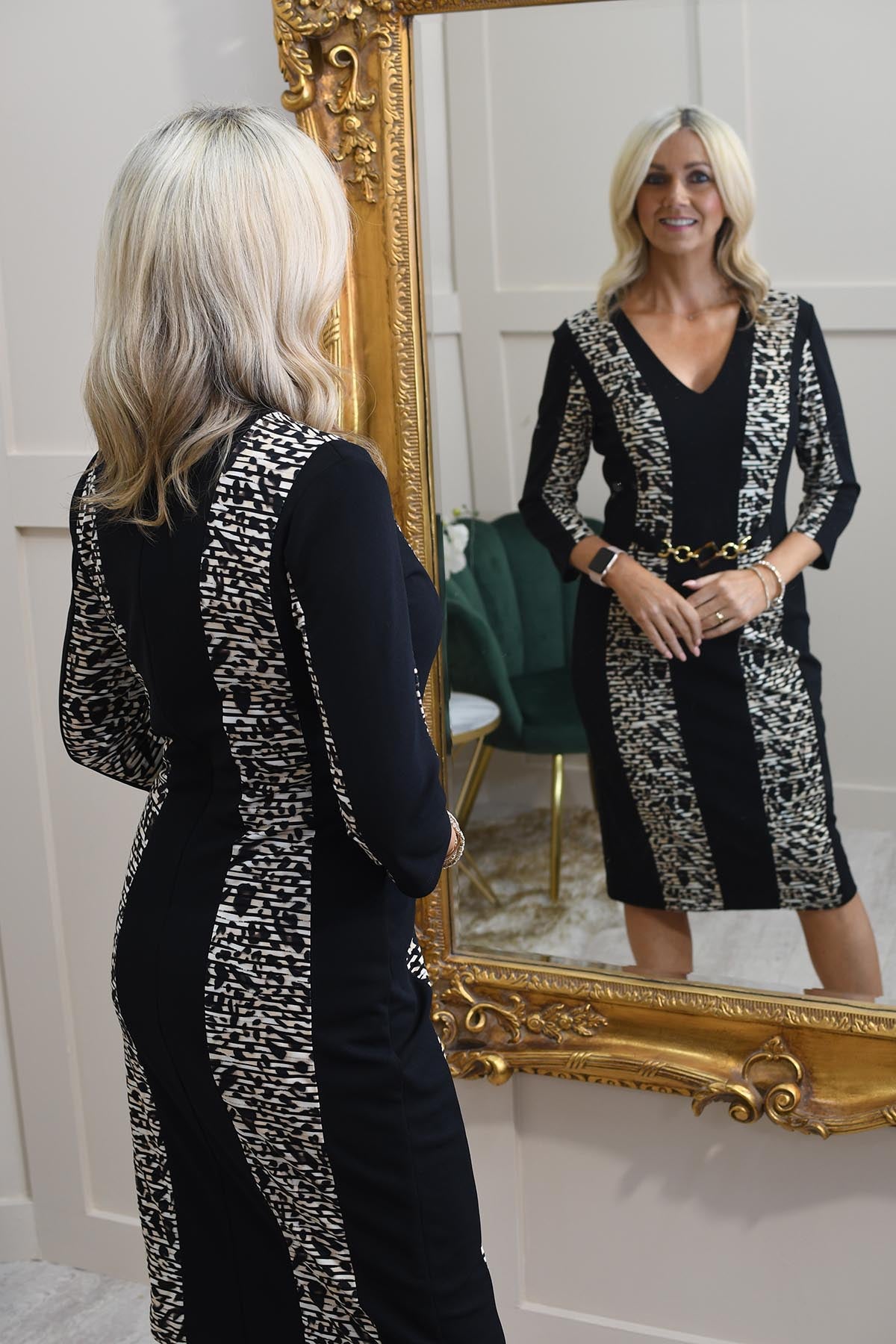Tia Black Dress With Leopard Print Panelling & Belt Detail Description