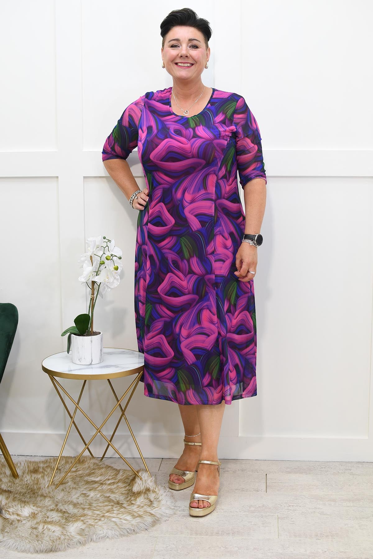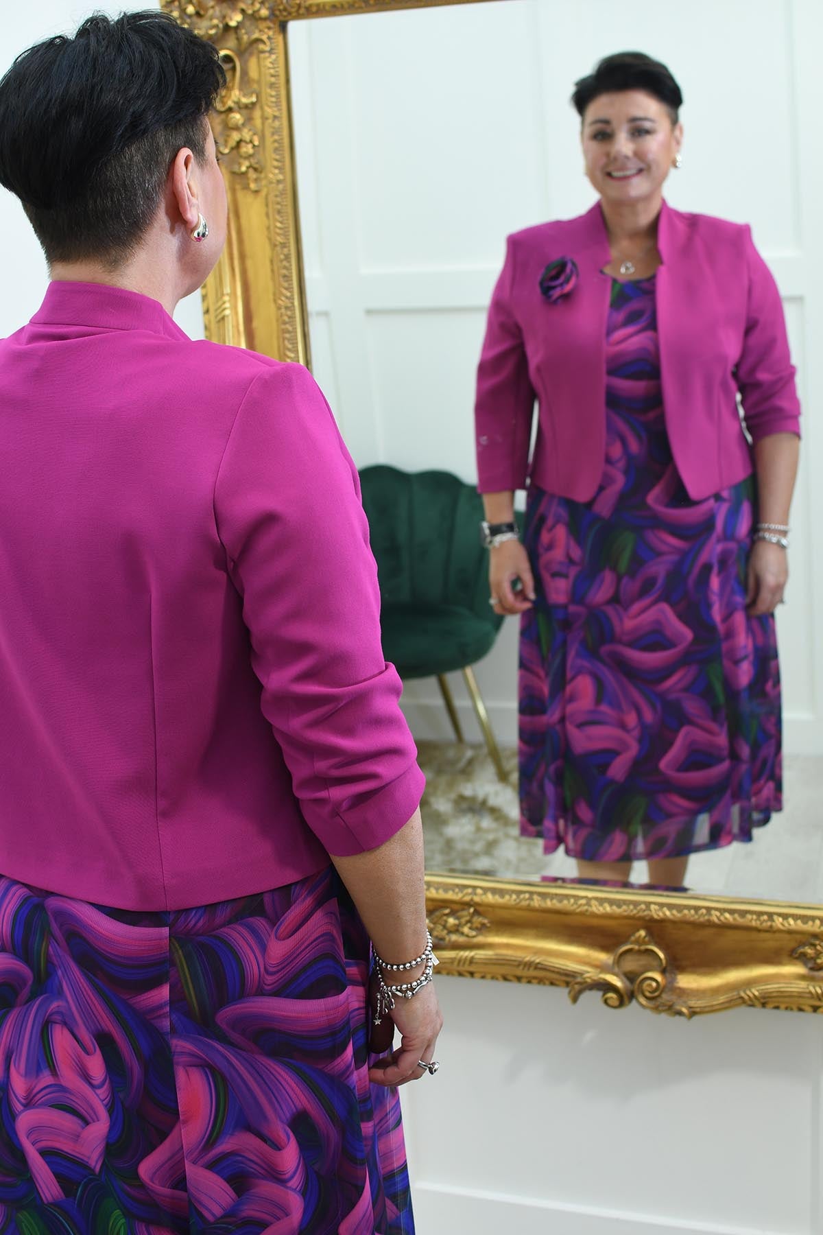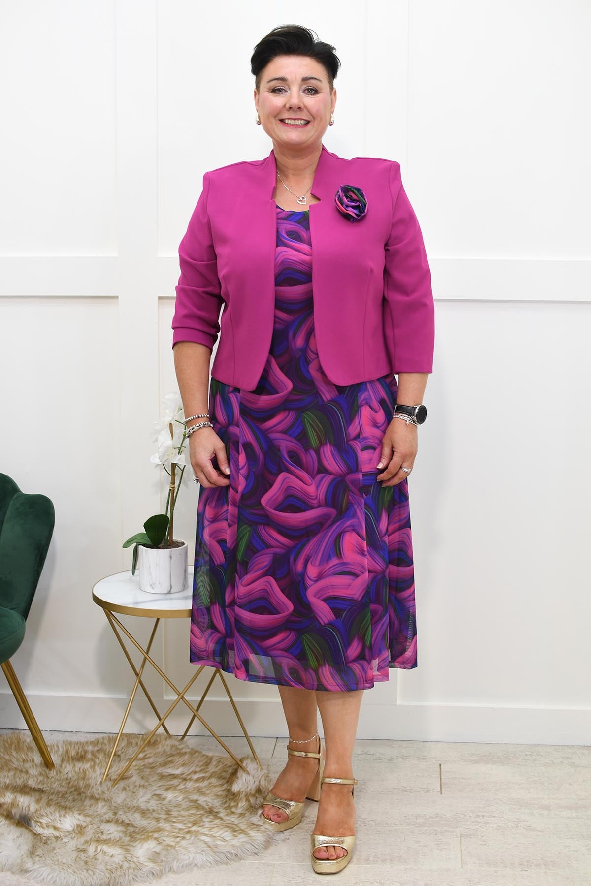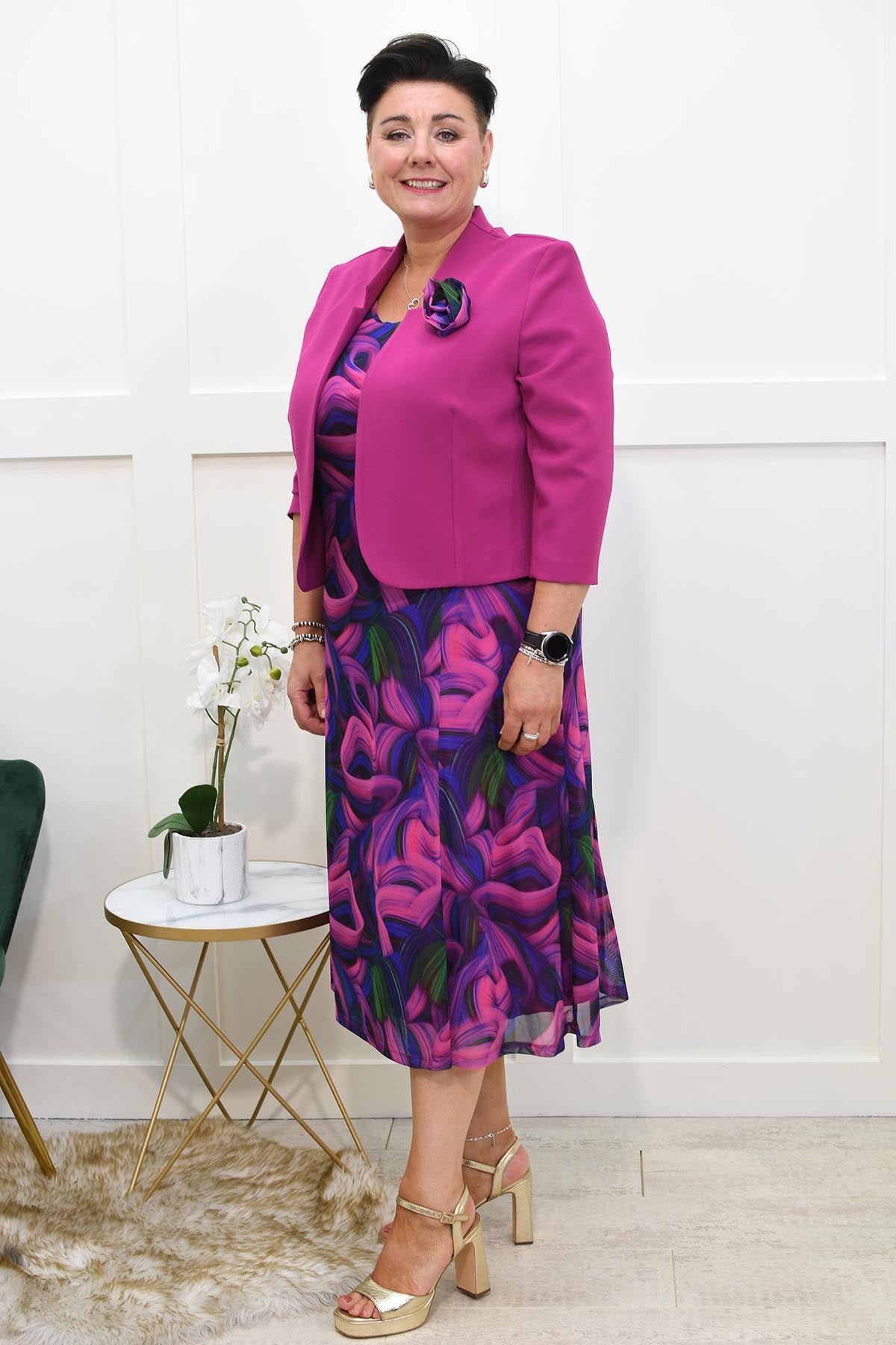 Turn heads and make a bold statement with the Via Veneto Cherry Pink, Blue & Green Swirl Dress With Bolero. This vibrant dress features an eye-catching swirl pattern in a stunning palette of cherry pink, blue, and green, creating a dynamic and lively look that's perfect for any special occasion.