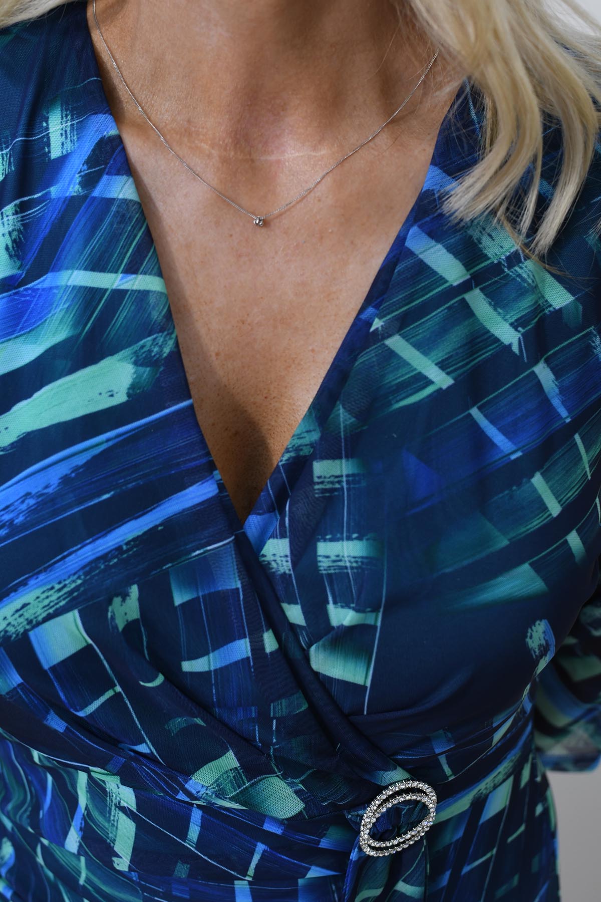 Turn heads with this jade and navy crosshatch pattern dress from Via Veneto, designed with a flattering silhouette and elegant buckle detail at the waist. Crafted from 100% polyester, it offers a lightweight, easy-care finish with a smooth drape that enhances the figure. The bold crosshatch print creates a modern, textured effect, while the buckle accent cinches the waist for a sophisticated touch. Perfect for both daywear and evening occasions, this versatile dress can be styled with heels for a polished dinner look or paired with flats for chic daytime elegance. A statement piece with timeless appeal.