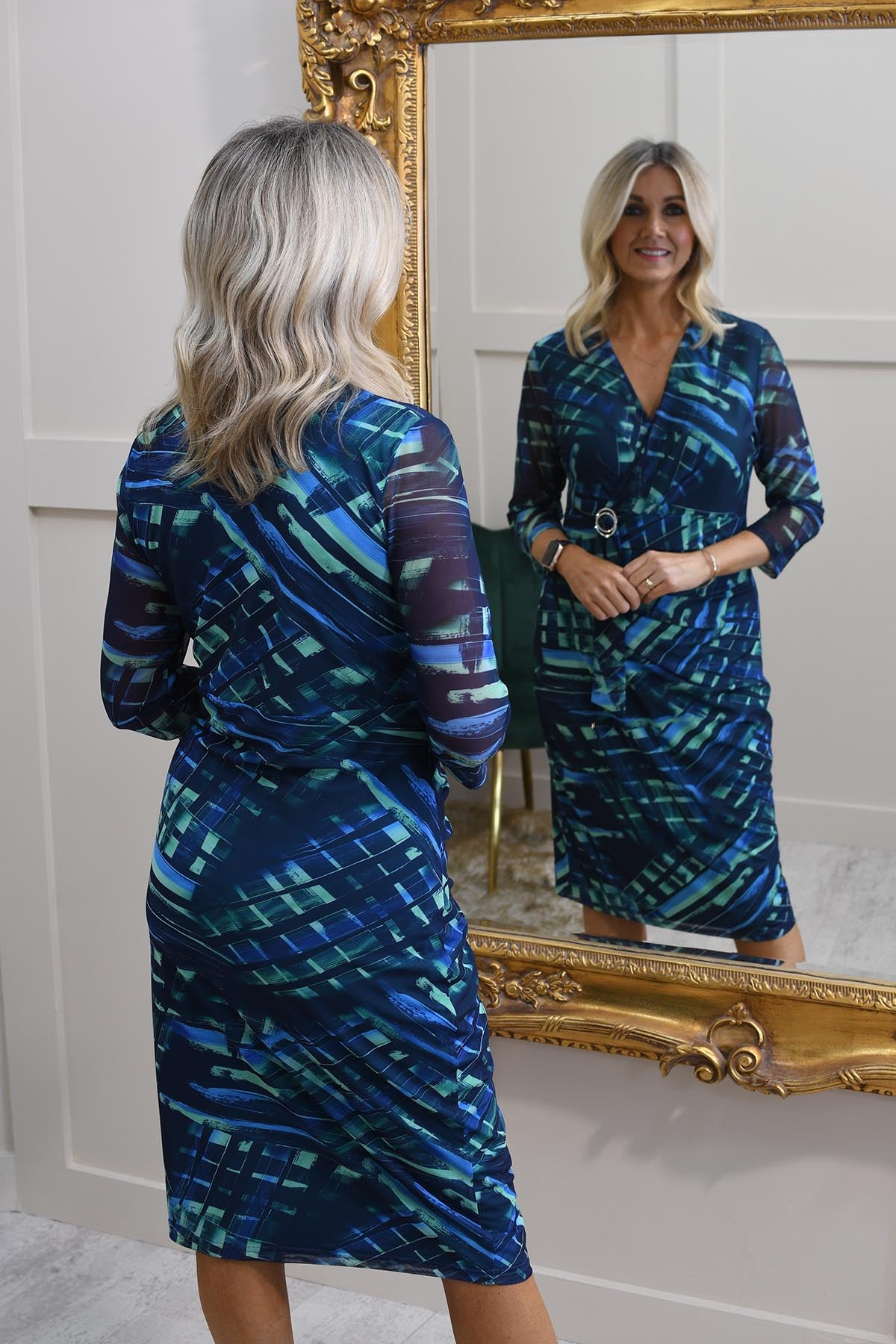 Via Veneto- Crosshatch Pattern Dress With Buckle Detail- Jade & Navy-A7125/V729