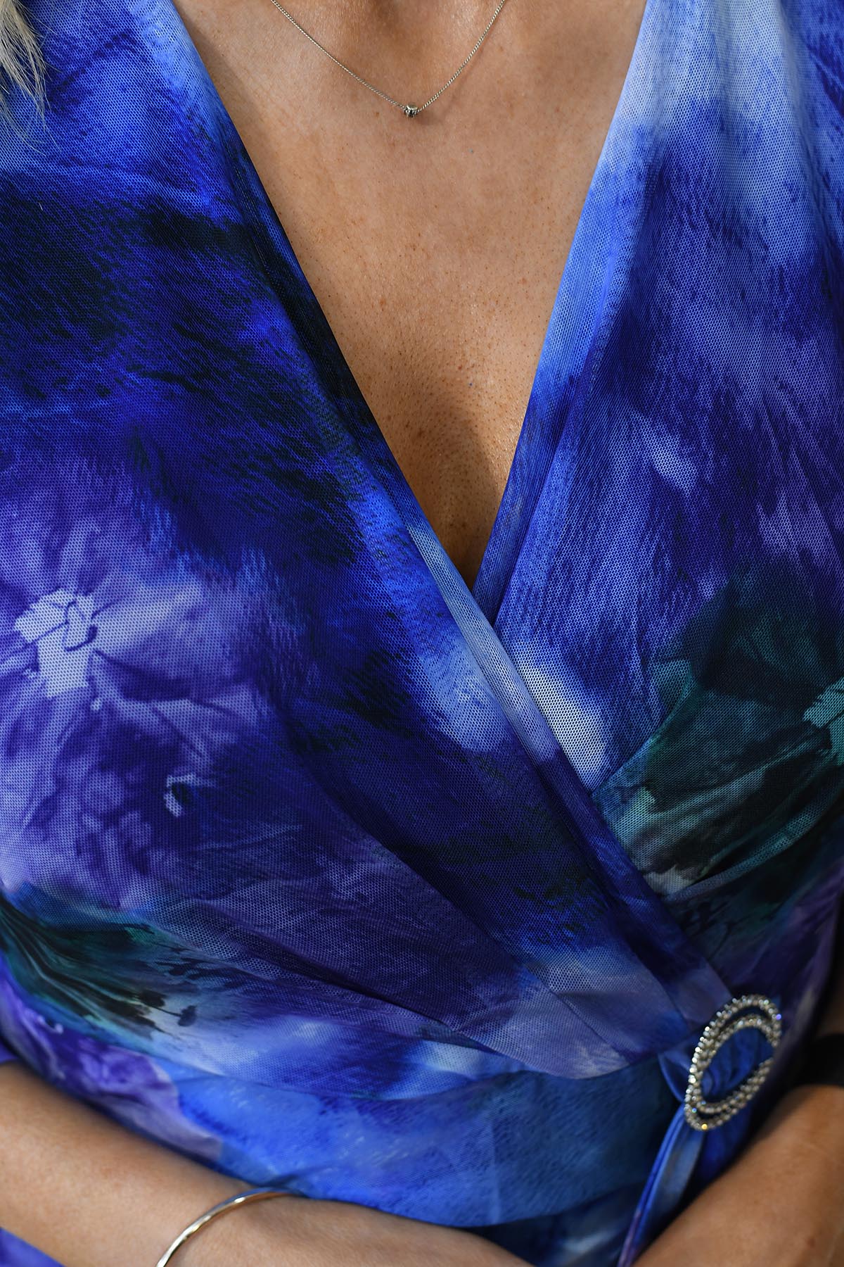 Bring feminine elegance to your wardrobe with this royal blue and purple floral print dress from Via Veneto, designed with a flattering waist buckle detail for added shape. Crafted from 100% polyester, it offers a lightweight, smooth drape that enhances the silhouette while remaining easy to care for. The bold floral print in rich jewel tones creates a striking look, perfect for both daytime events and evening occasions. Pair with heels and statement accessories for a polished dinner outfit or wear with flats for chic daytime style. A versatile piece that blends timeless floral design with modern sophistication.