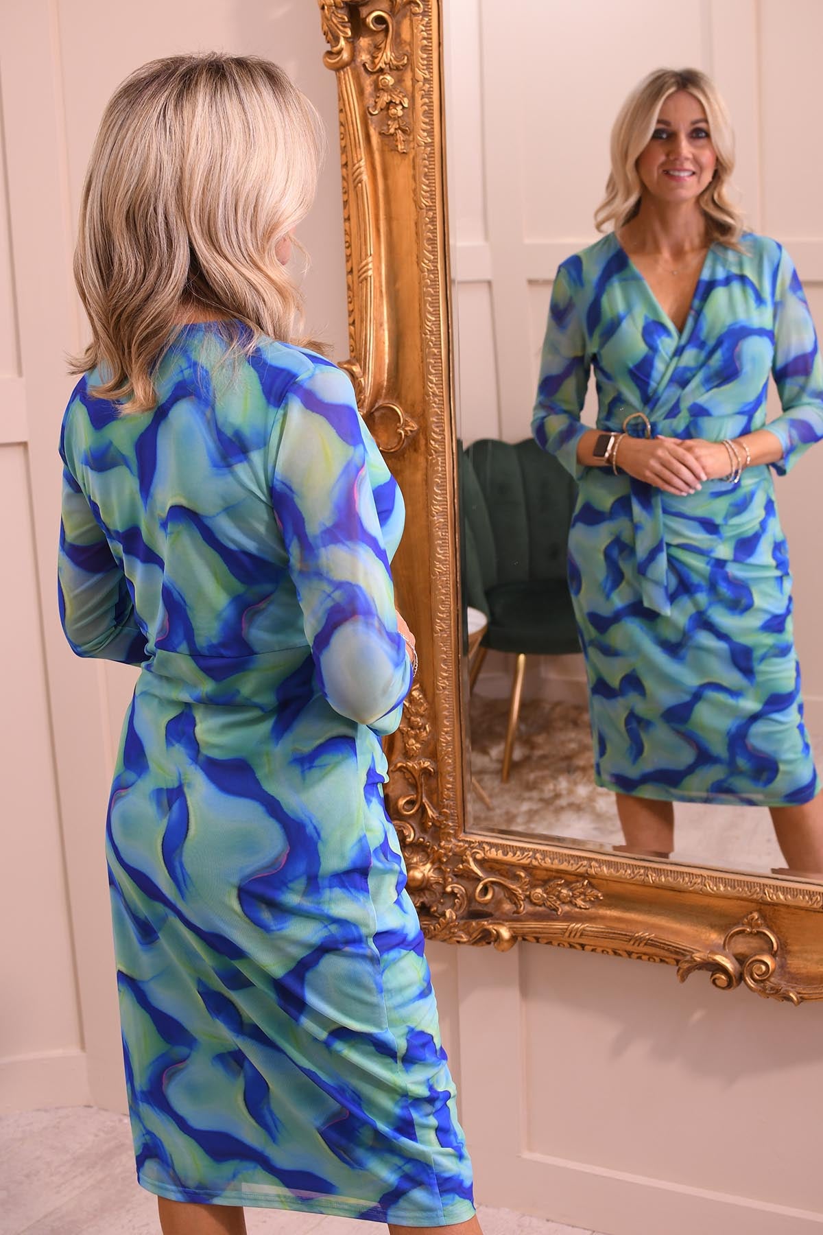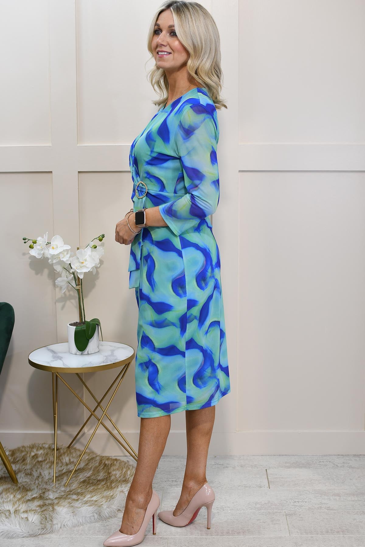 Via Veneto Jade & Blue Print Dress With Buckle Detail- V345