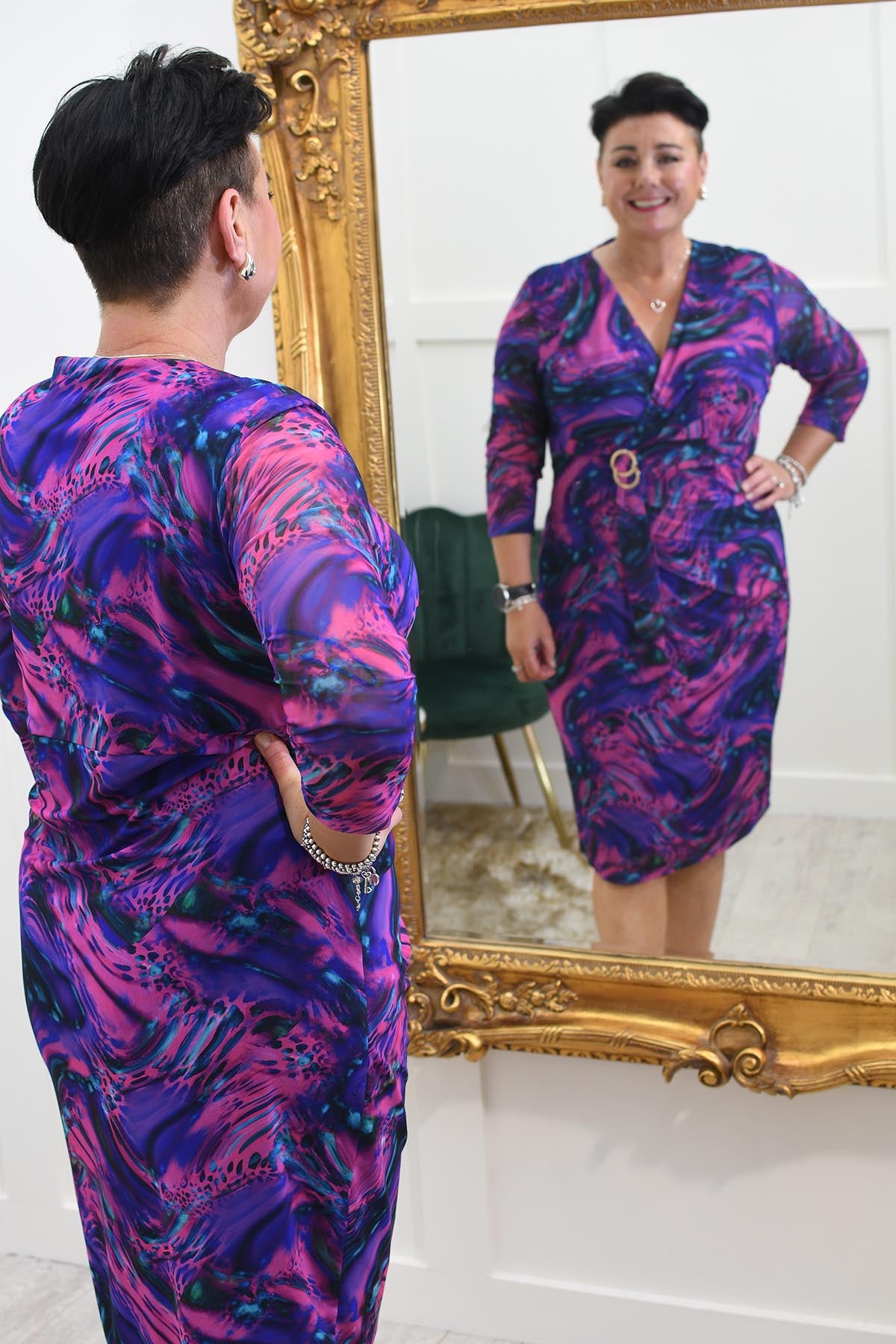 Elevate your wardrobe with the Via Veneto Pink, Purple & Teal V Neck Dress, a stunning piece that blends vibrant colours and elegant design. This eye-catching dress features a dynamic pattern with shades of pink, purple, and teal, creating a visually striking and sophisticated look. The V-neckline adds a touch of allure, while the fitted silhouette beautifully enhances your figure.