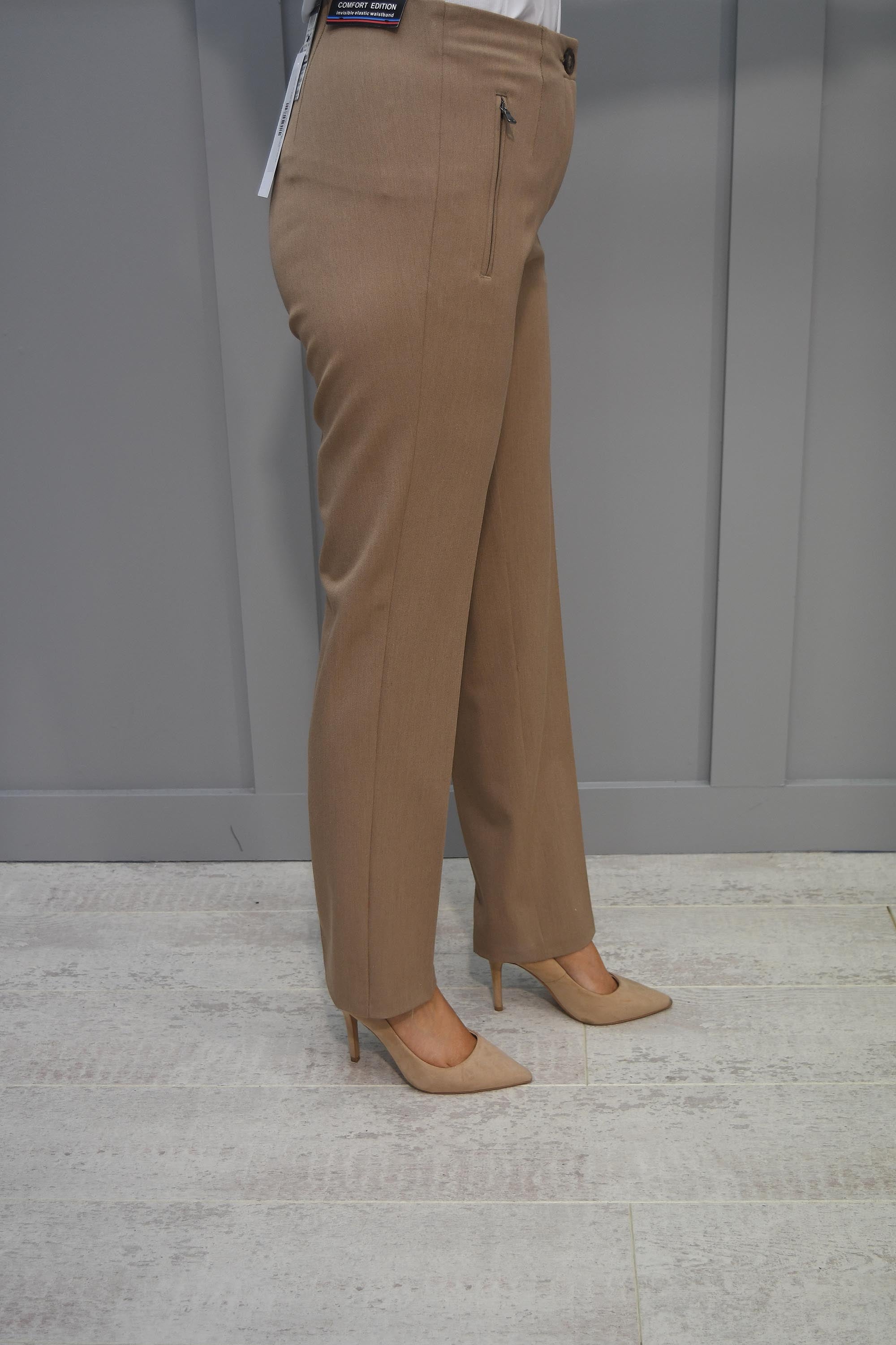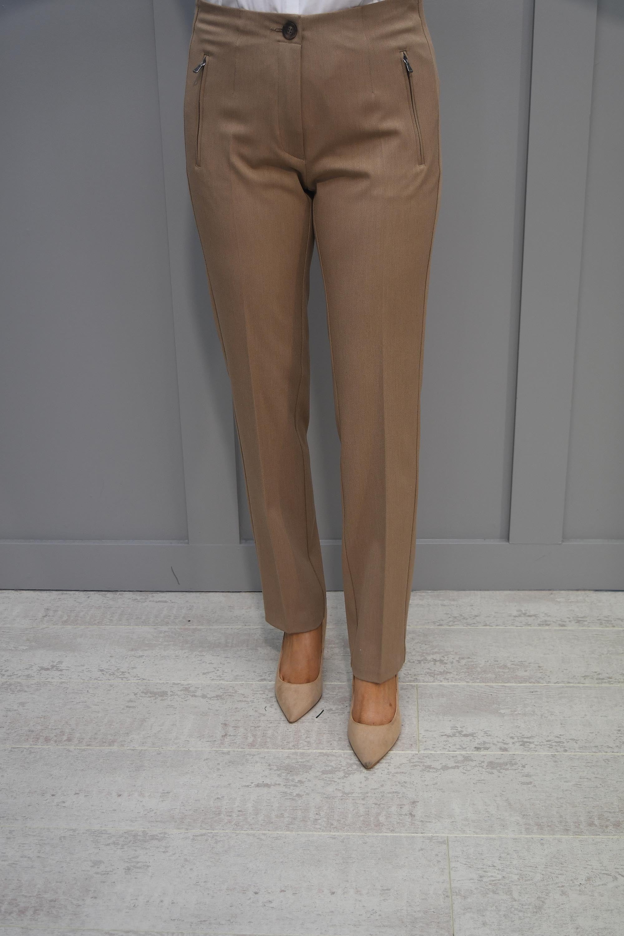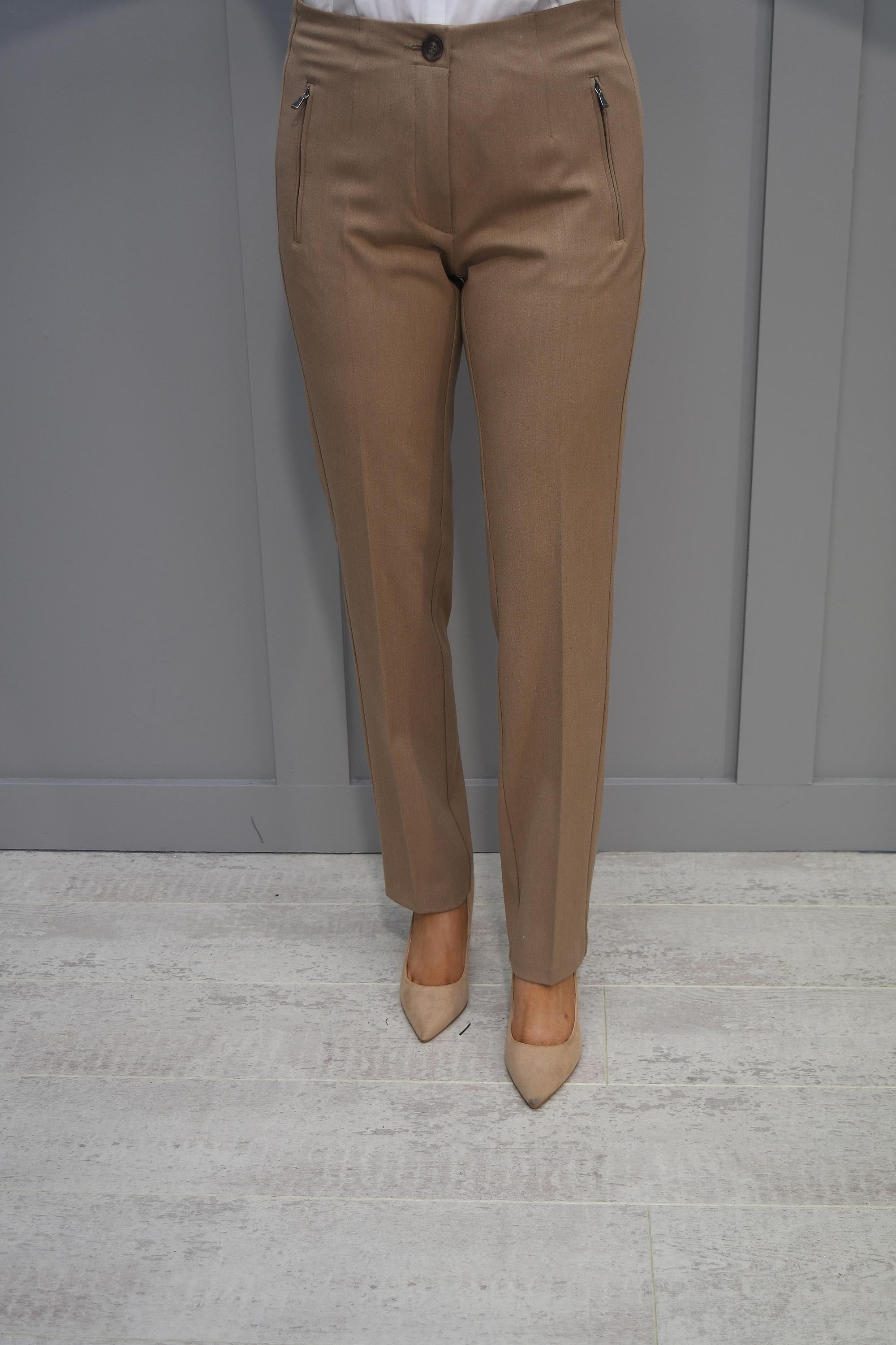 Balance comfort with style with these gorgeous Jane Camel Trousers With Front Zips by Zerres. Crafted from soft camel-toned fabric, these sophisticated trousers are flattering, comfortable and incredibly versatile. These bottoms feature slim-fit legs, a high waistline, and two handy zip-up pockets, creating the perfect trousers for work or play.
